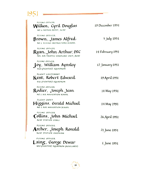 | 80002673 | Wilken | Cyril Douglas | December 19, 1951 | Flying Officer | No. 6 Repair Depot, RCAF |