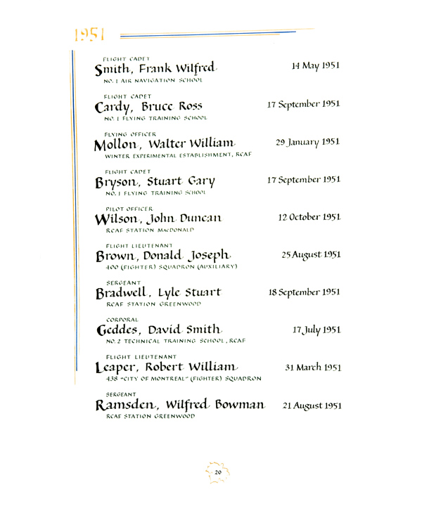 | 80002684 | Wilson | John Duncan | October 12, 1951 | Pilot Officer | RCAF Station MacDonald |