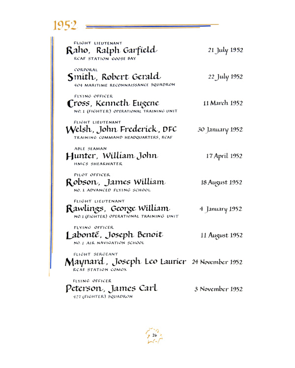 | 80002665 | Welsh | John Frederick | January 30, 1952 | Flight Lieutenant | Training Command Headquarters, RCAF |