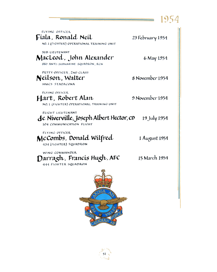 | 80002724 | de Niverville | Joseph Albert Hector | July 19, 1954 | Flight Lieutenant | 104 Communication Flight |