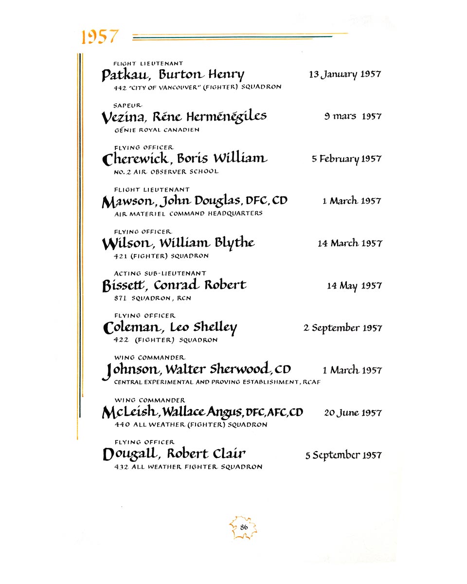 | 80002445 | Patkau | Burton Henry | January 13, 1957 | Flight Lieutenant | 442 "City of Vancouver" (Fighter) Squadron |