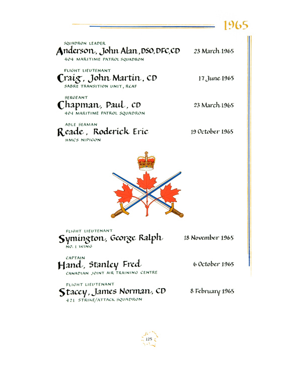 | 80002145 | Hand | Stanley Fred | October 6, 1965 | Captain | Canadian Joint Air Training Centre |