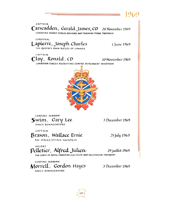 | 4502938 | Carscadden | Gerald James | November 24, 1969 | Captain | Canadian Armed Forces Advisory and Training Team Tanzania |