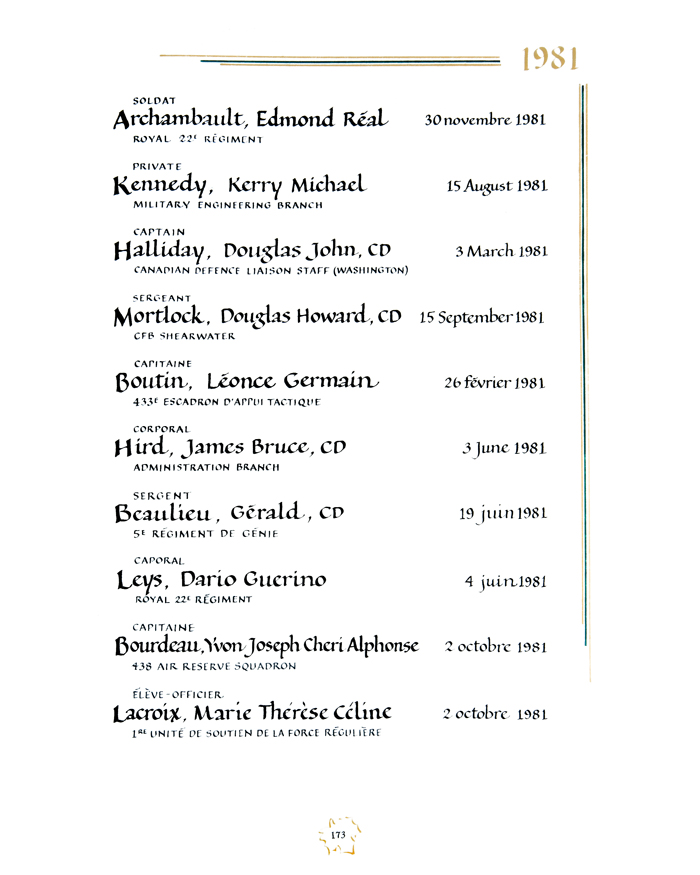 | 80002996 | Hird | James Bruce | June 3, 1981 | Corporal | Administration Branch |