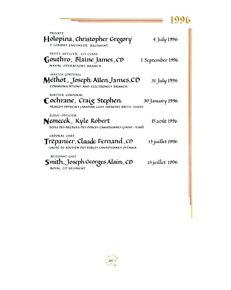 | 80002622 | Trépanier | Claude Fernand | July 13, 1996 | Caporal-chef | Unité de soutien des forces canadiennes Ottawa |