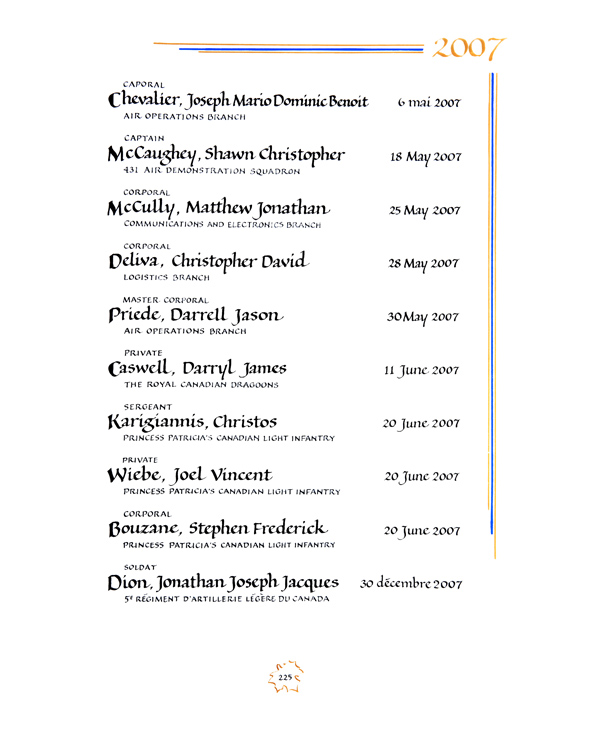 | 80003385 | Karigiannis | Christos | June 20, 2007 | Sergeant | Princess Patricia's Canadian Light Infantry |