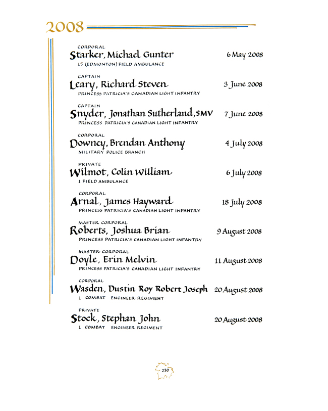 | 80003457 | Snyder | Jonathan Sutherland | June 7, 2008 | Captain | Princess Patricia's Canadian Light Infantry |