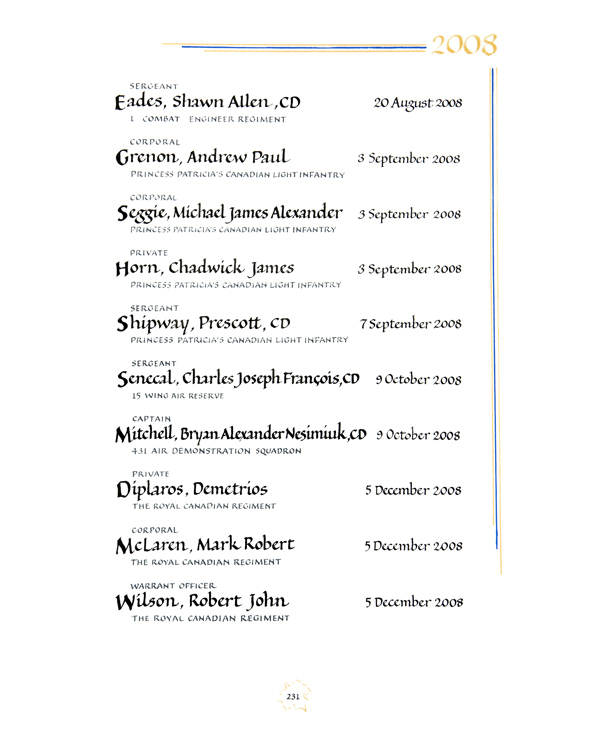 | 80003484 | Seggie | Michael James Alexander | September 3, 2008 | Corporal | Princess Patricia's Canadian Light Infantry |