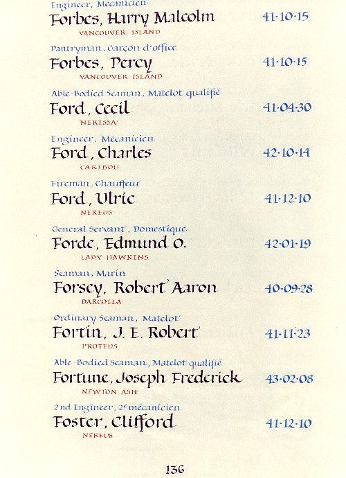| 2558141 | Forbes | Harry Malcolm | October 15, 1941 | Engineer | Vancouver Island |
