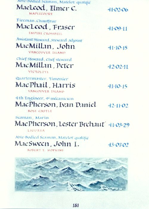 | 2640129 | MacPherson | Lester Brehaut | March 29, 1941 | Seaman | Liguria |