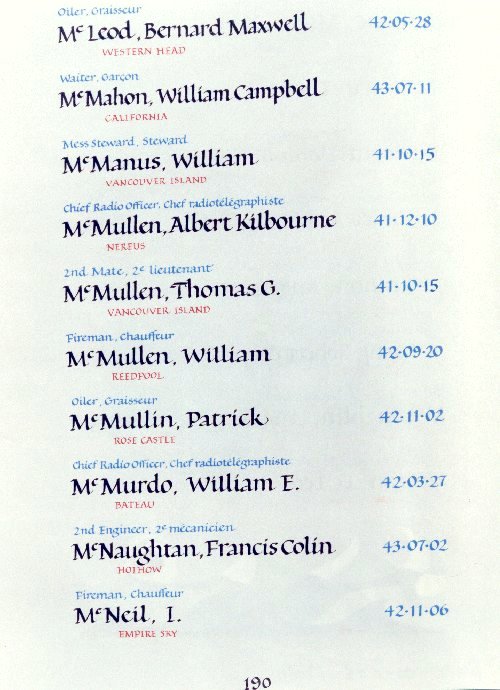 | 2640109 | McMullen | Thomas G. | October 15, 1941 | 2nd Mate | Vancouver Island |