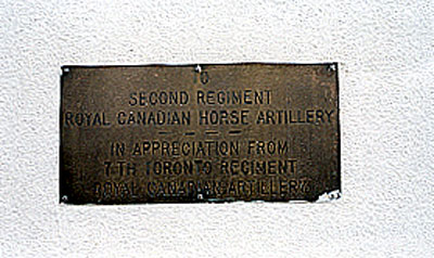 This memorial is dedicated to the 2nd Regiment, Royal Canadian Horse Artillery. It was erected by the 7th Toronto Regiment of the Royal Canadian Artillery.