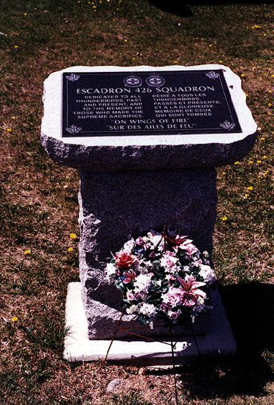 The 426 Squadron Memorial was created by the 426 "Thunderbird" Squadron Association. It was dedicated on August 15, 2000.