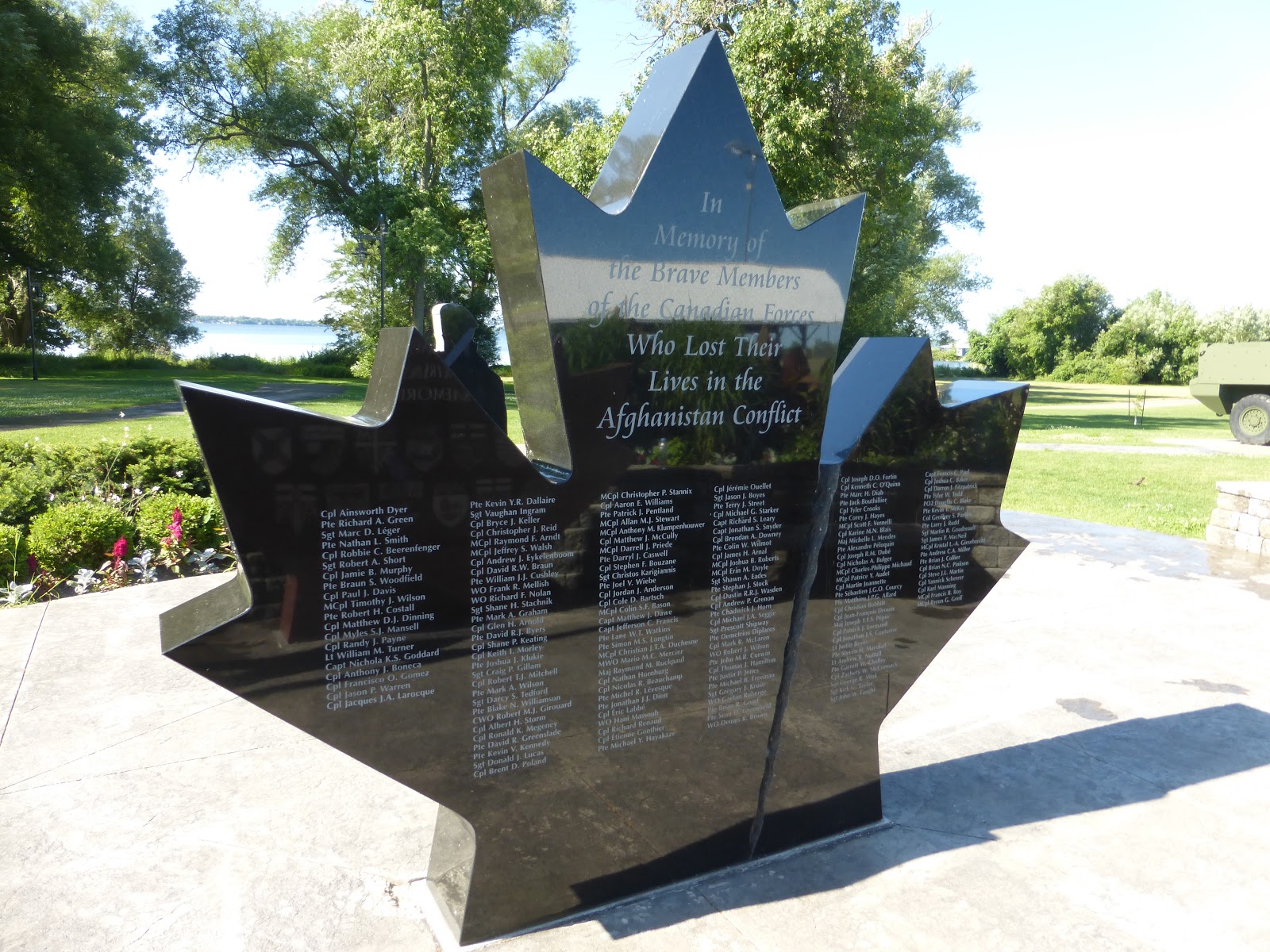 The Afghanistan Repatriation Memorial was paid for by donations through the Give to Honour Those Who Gave campaign and unveiled on November 10, 2012. It features two large granite maple leaves. The red maple leaf is inscribed with the Canadian Forces emblem and provincial shields. The black maple leaf is inscribed with the names of the 158 soldiers who have died in Afghanistan. A granite silhouette of a soldier stands in front. The maple leaves are flanked by two Canadian flags and two granite benches.