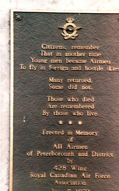 The Airmen Memorial is dedicated to all airmen from Peterborough and District. It was erected by the 428 Wing Royal Canadian Air Force Association on June 5, 1971.