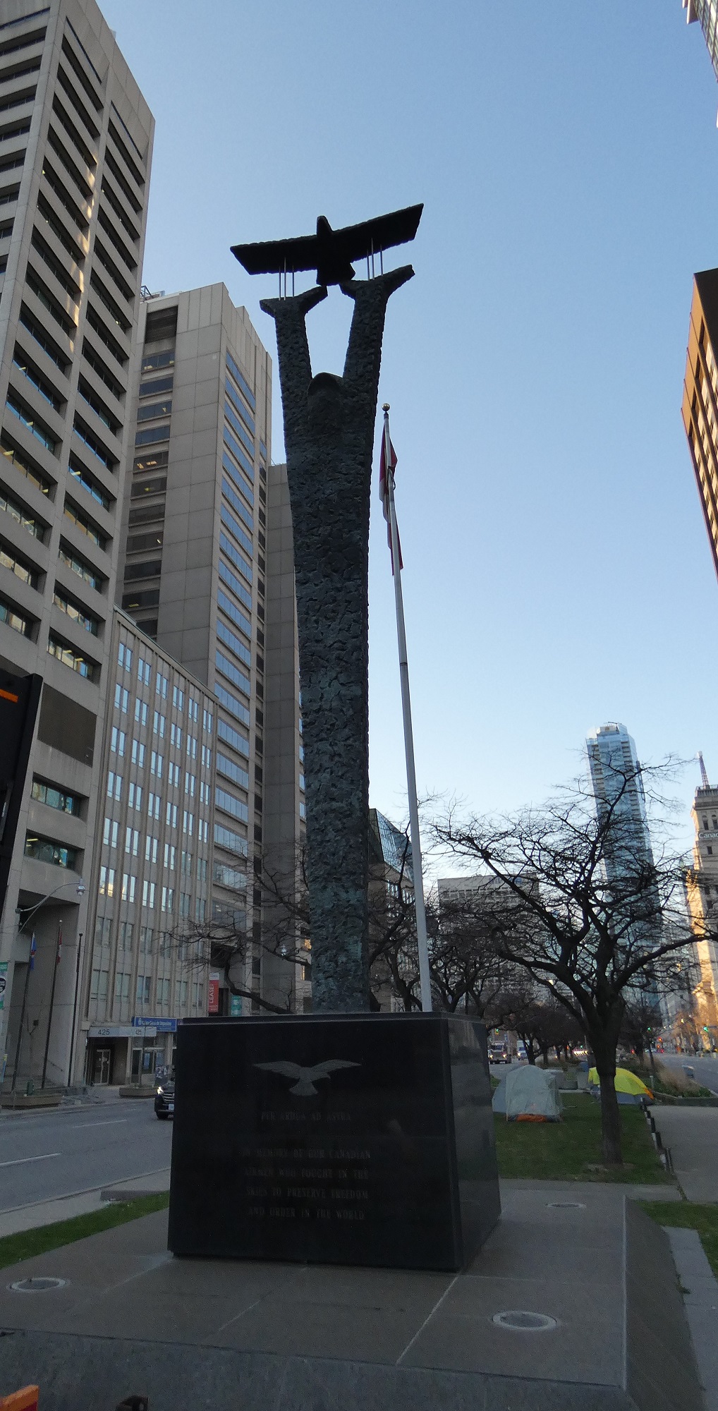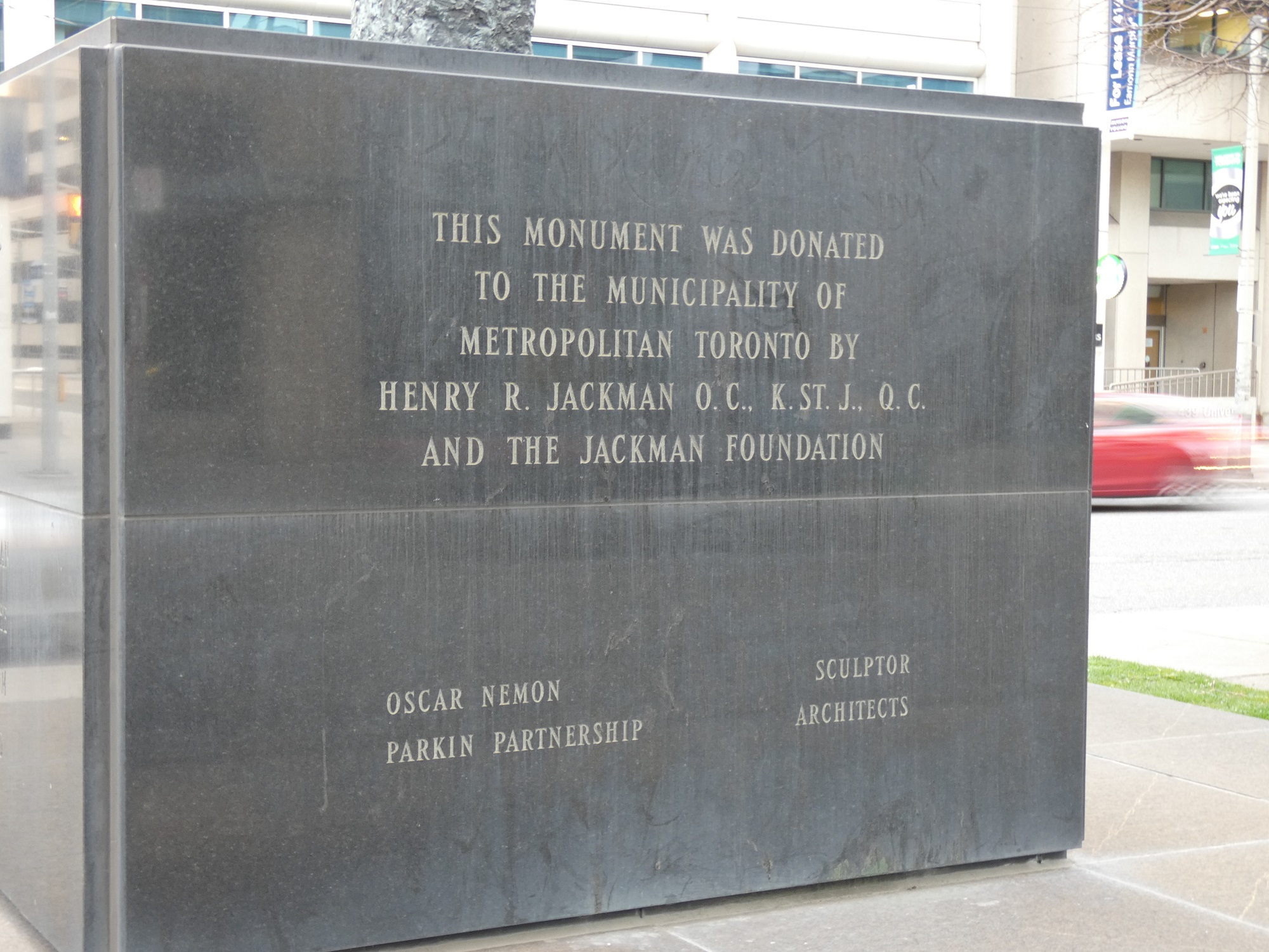 This monument was donated to the Municipality of Metropolitan Toronto by Henry R. Jackman O.C., K.St. J., Q.C. and the Jackman Foundation. It was dedicated by Queen Elizabeth in 1984. The bronze and marble monument was designed by Oscar Nemon.