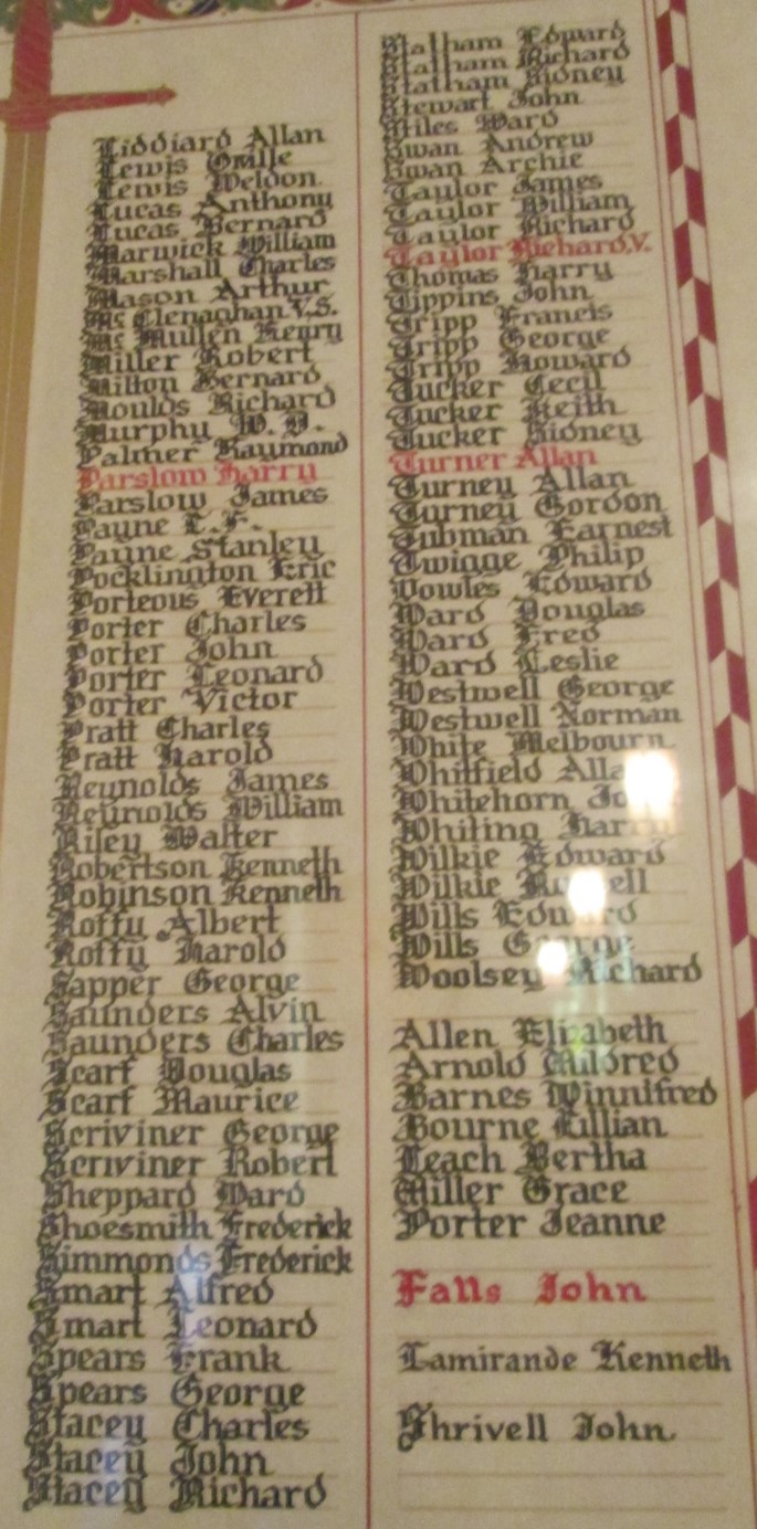 The scroll has names arranged in four columns, and although not specified on the scroll, it appears members who gave their lives have their names written in red.