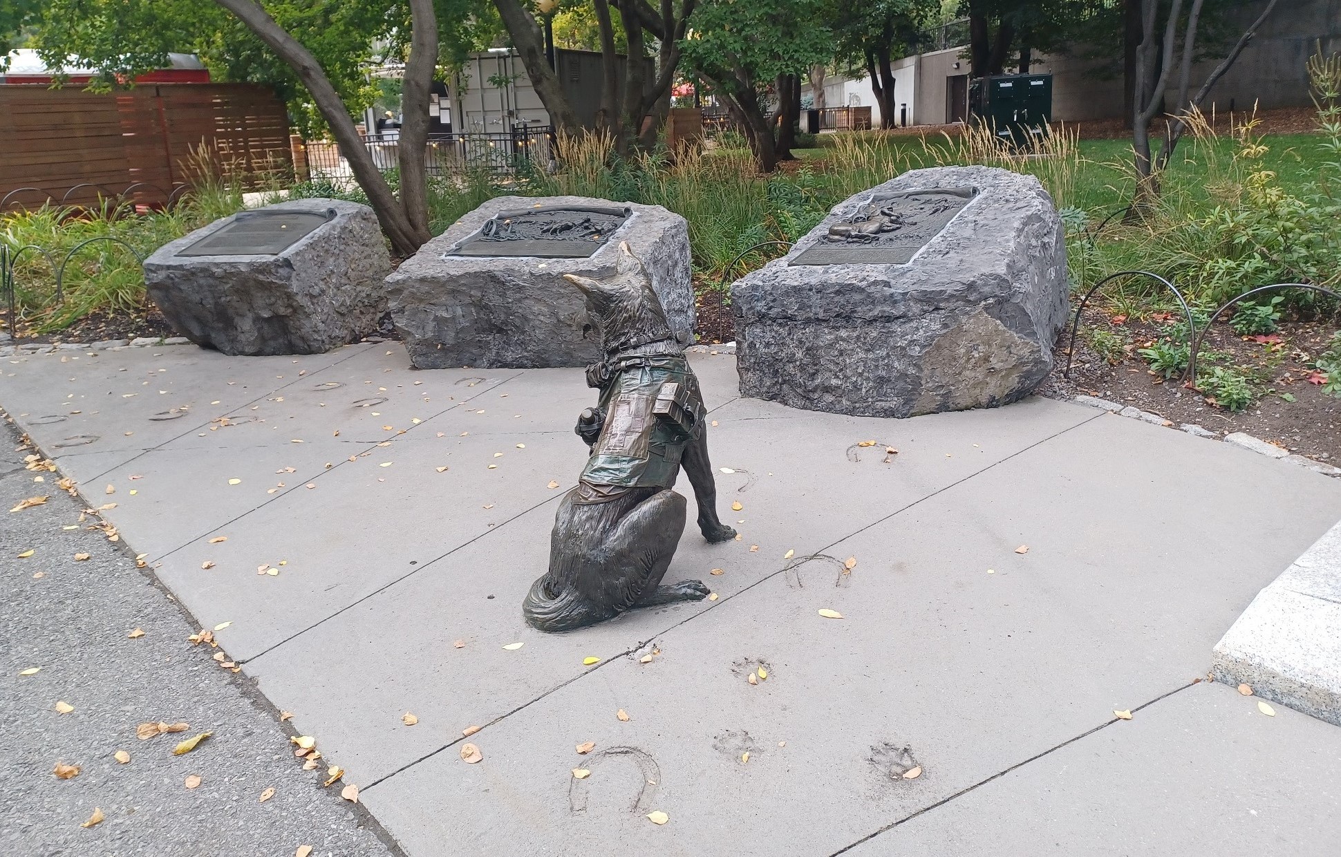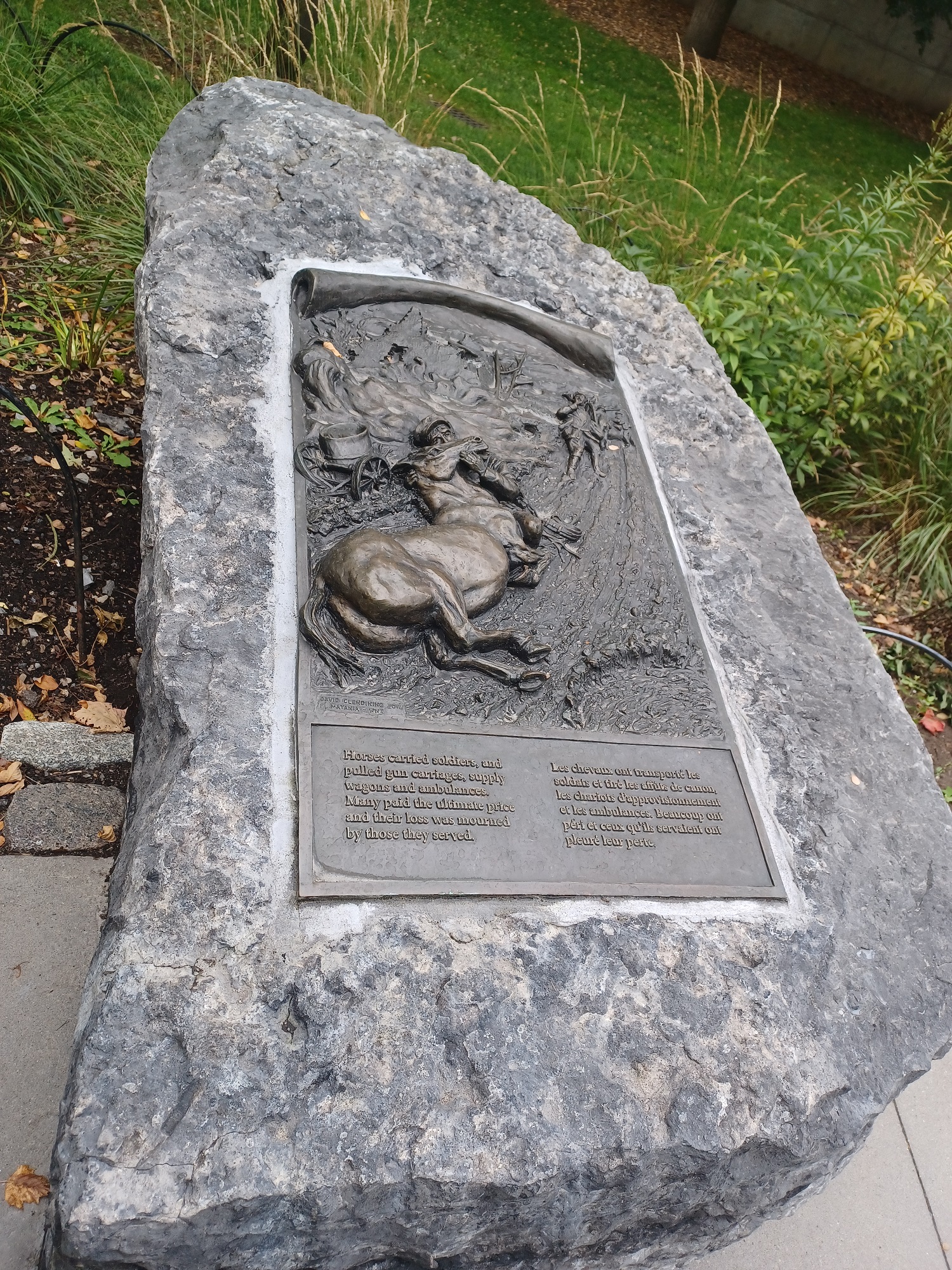 The Animals in War Dedication honours animals that served alongside their human comrades in war. It is symbolically set next to the South African War Memorial, a battle for which Canada supplied 50,000 horses for mounted troops. The footprints of dogs, horses and mules are stamped into the concrete of the Animals in War Dedication, representing the marks they left on the battlefield.