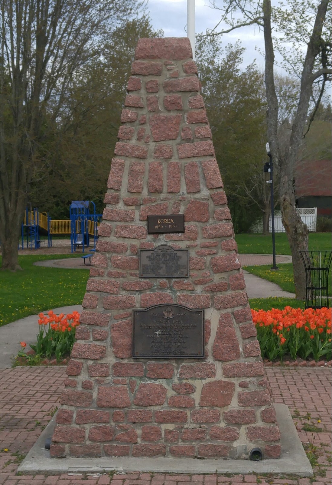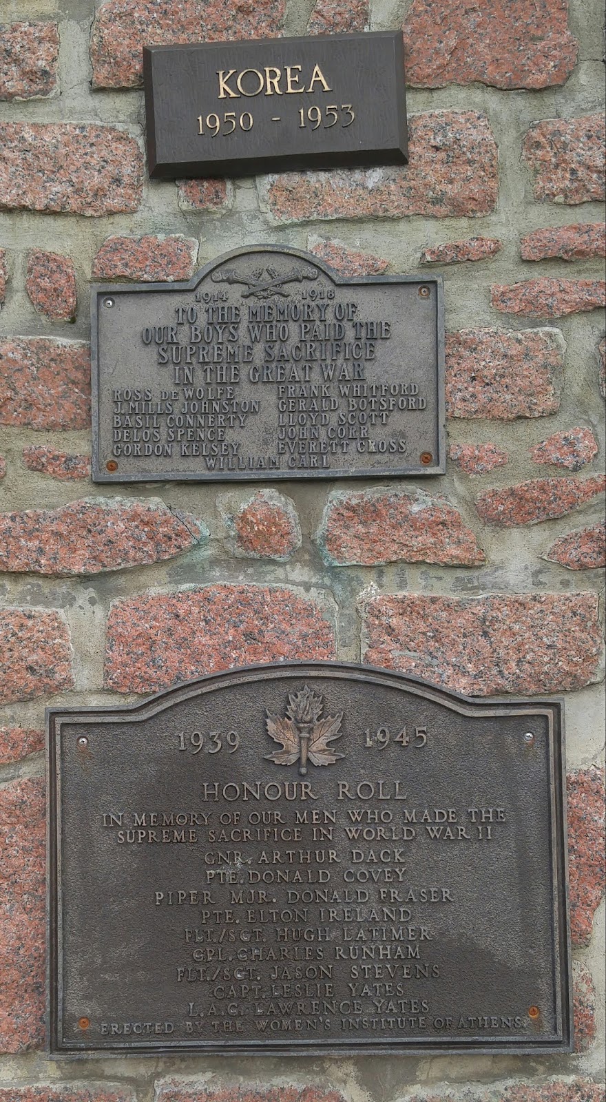 This memorial is dedicated to those who fought in the First and Second World Wars and the Korean War. It was erected by the Women's Institute, Athens.