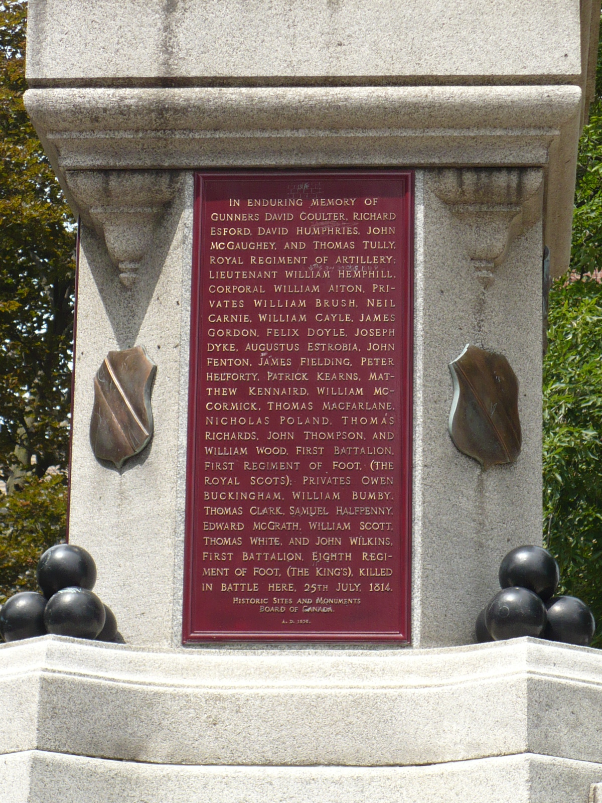 The memorial features three plaques and several adornments, including cannons and is located at the site of the bloodiest battle of the War of 1812 - Lundy’s Lane. On the afternoon of 25 July, 1814, Lieutenant-General Gordon Drummond with about 2,800 men engaged the invading American Army which had recently been victorious at Chippewa. The armies were evenly matched and the six-hour battle lasted until darkness and heavy losses put an end to the fighting. Each force had lost over 800 men. Although each claimed victory, the Americans had failed to dislodge Drummond from his position. They withdrew the next day, ending their offensive in Upper Canada.