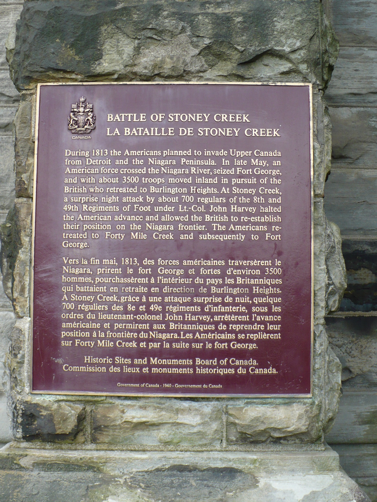 The Battlefield Monument was constructed in memory of those who fought in the Battle of Stoney Creek - War of 1812. The Hamilton architectural firm of F.J. Rastrick and Sons prepared plans for the monument in 1900 with Edward L. Rastrick overseeing the design. The first sod was turned by Countess Grey on May 28, 1909 and the corner stone was laid by General French in a ceremony on May 26, 1910, with F.H. Dickenson in charge of the construction. Problems securing government funding caused delays throughout 1911. Work recommenced in 1912 when the Department of Militia and Defence guaranteed additional funds. On June 6, 1913, the monument was unveiled by Queen Mary via telegraph from Buckingham Palace.