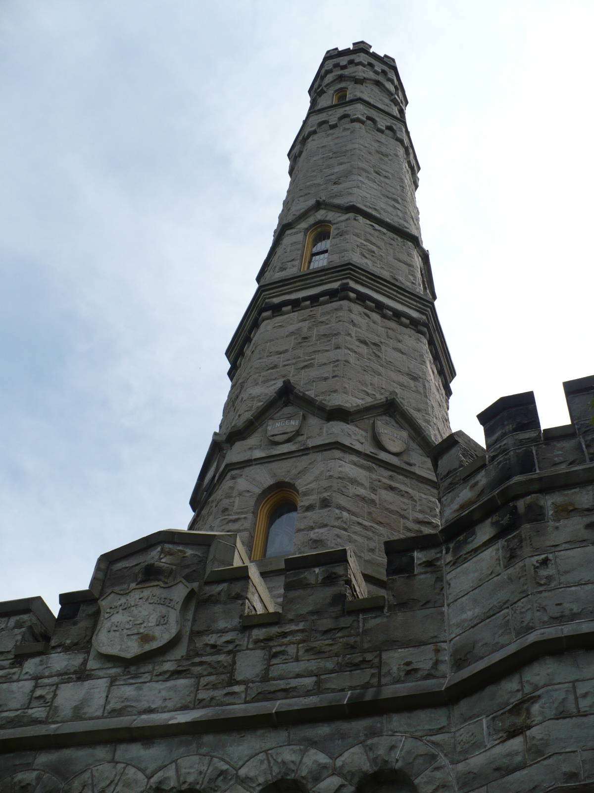 It is constructed of stone and measures 100 feet high, symbolizing the one hundredth anniversary of the battle on the date it was unveiled. This height also recognizes the one hundred years of peace between the United States and Canada which followed the War of 1812 - one foot of stone for every year of peace. The design was chosen to resemble the early 19th century Nelson Monument in Edinburgh, Scotland. A square base is topped by a tapering octagonal tower with Tudor Gothic Revival style detailing (crenellation, coping, corbels, shield motifs, heavy oak doorway, turrets, buttresses). Observation decks at the top of the base and at the top of the tower offer views of the entire battlefield. The interior spiral staircase is staged with broad landings.