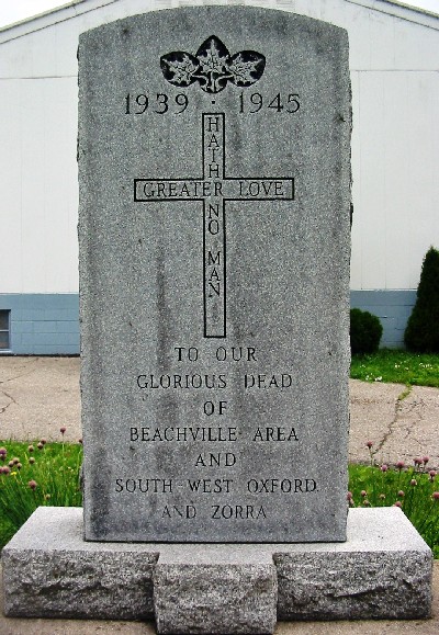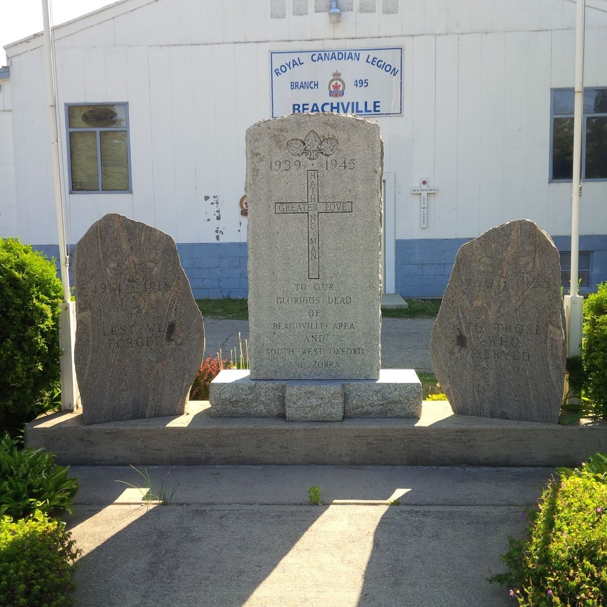In 1986, a new cenotaph was dedicated in front of the Beachville Legion Branch No. 495 to commemorate those that served in the First and Second World Wars and the Korean War. It is partly constructed from Oxford County fieldstone.