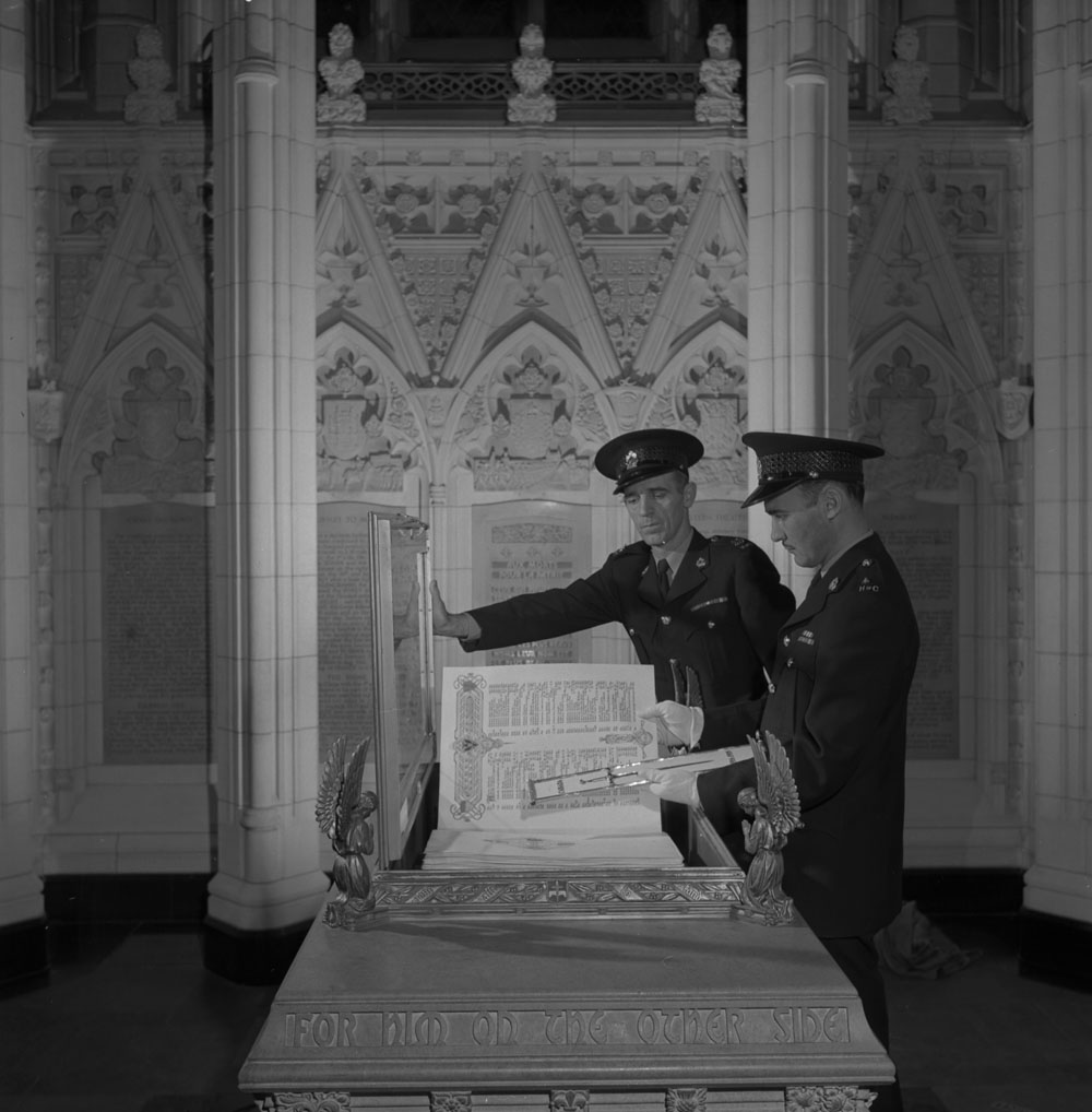 In 1959, high temperatures and humidity inside the Memorial Chamber destroyed the bindings of the First and Second World War Books. Consequently, new red Levant (goatskin) leathers were obtained and both books were rebound. The Chamber is now temperature controlled, and the Books' glass enclosures also provide protection.