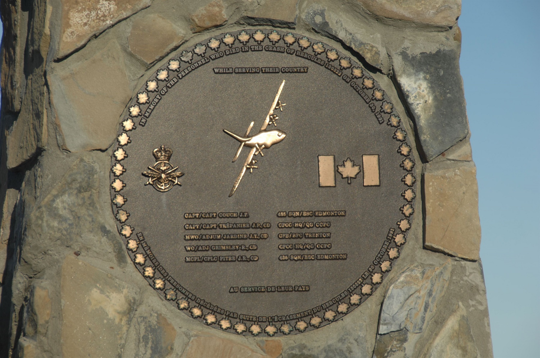 After being dedicated at the crash site, the cairn was taken to 8 Wing, from where all Boxtop resupply missions now originate, and placed on the grounds of the National Air Force Museum of Canada in front of the CC-130 Hercules on display there. On the front of the granite cairn is a brass plaque that describes the crash and its aftermath. On the reverse are the names of the five who died, the Air Command and Communication Command crests, and an image of a Hercules aircraft surrounded by maple leaves. An identical plaque was placed on a Boxtop 22 cairn that was dedicated in 1993 at Canadian Forces Station Alert. Surmounting the cairn is another piece of granite, carved and engraved to represent the tail of the crashed Hercules.
