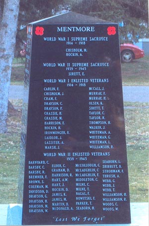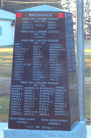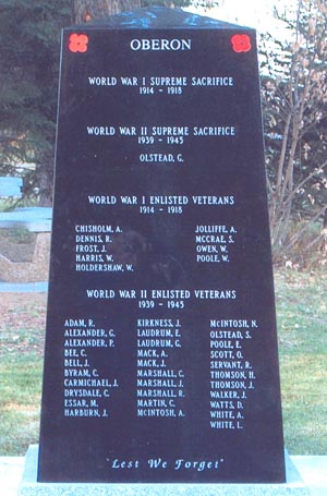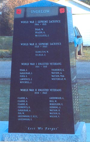 Erected by the community, volunteers and family members of those listed on the memorial, on Thanksgiving Day October 10, 2003, this memorial is dedicated to soldiers from the Brookdale, Ingelow, Mentmore and Oberon Communities, who served during the First and Second World Wars and Korea. This memorial is made of black shanise marble imported from China and weighs 4,800 lbs.
