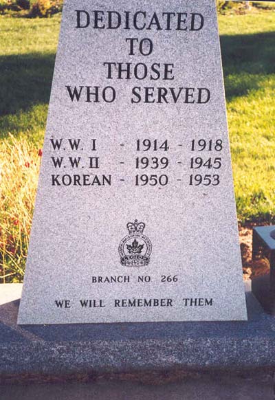 This memorial is dedicated to those who served in the First and Second World Wars and the Korean War. It was erected by the Royal Canadian Legion Branch 266.