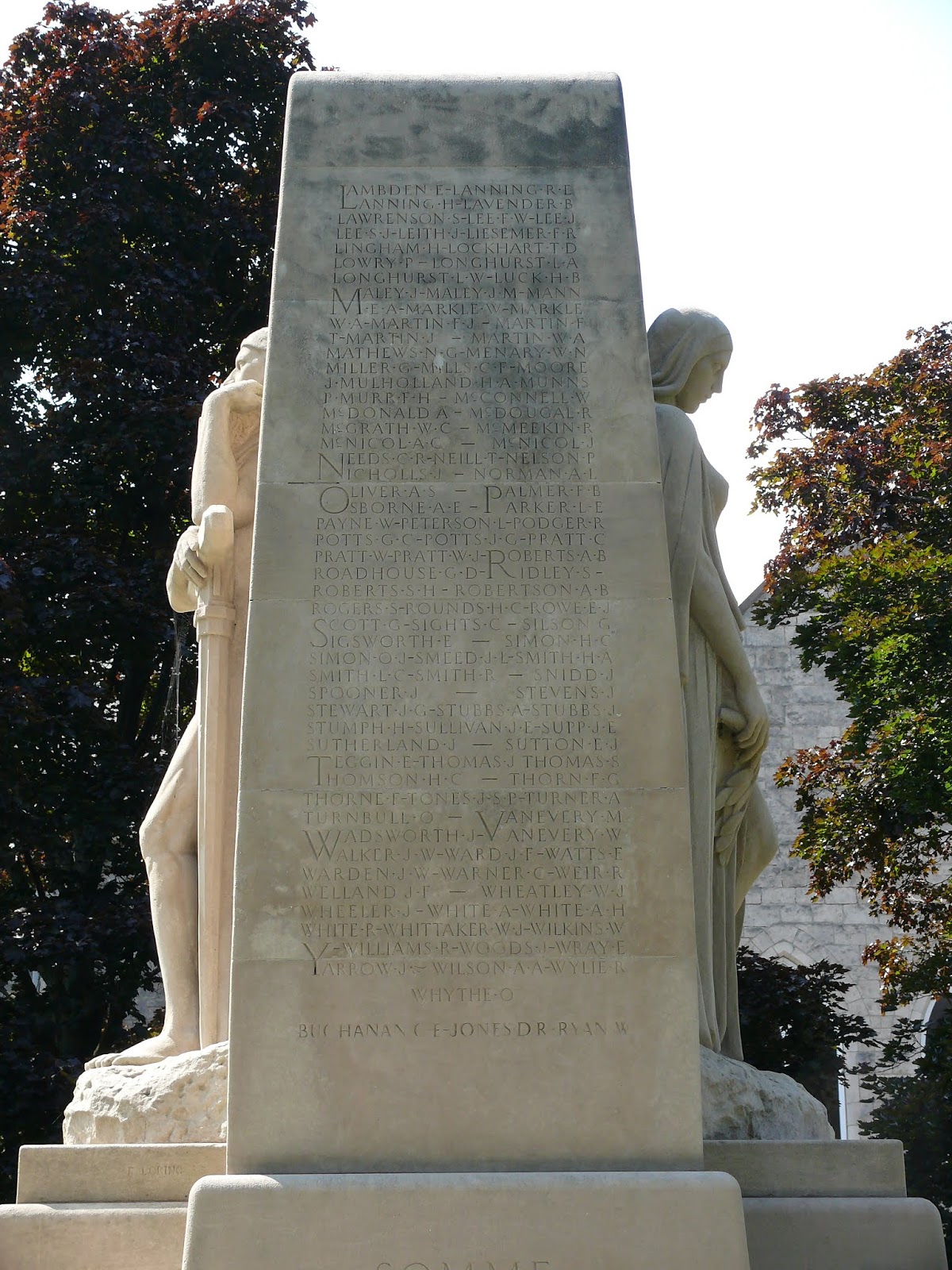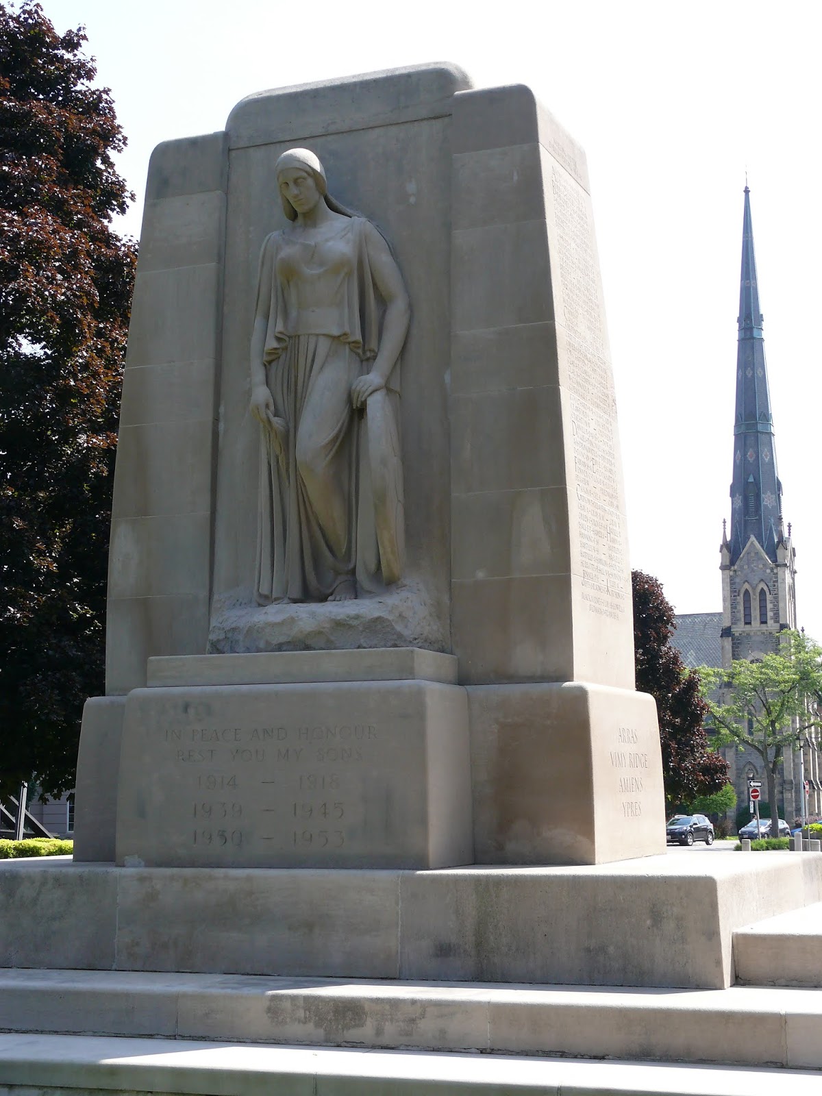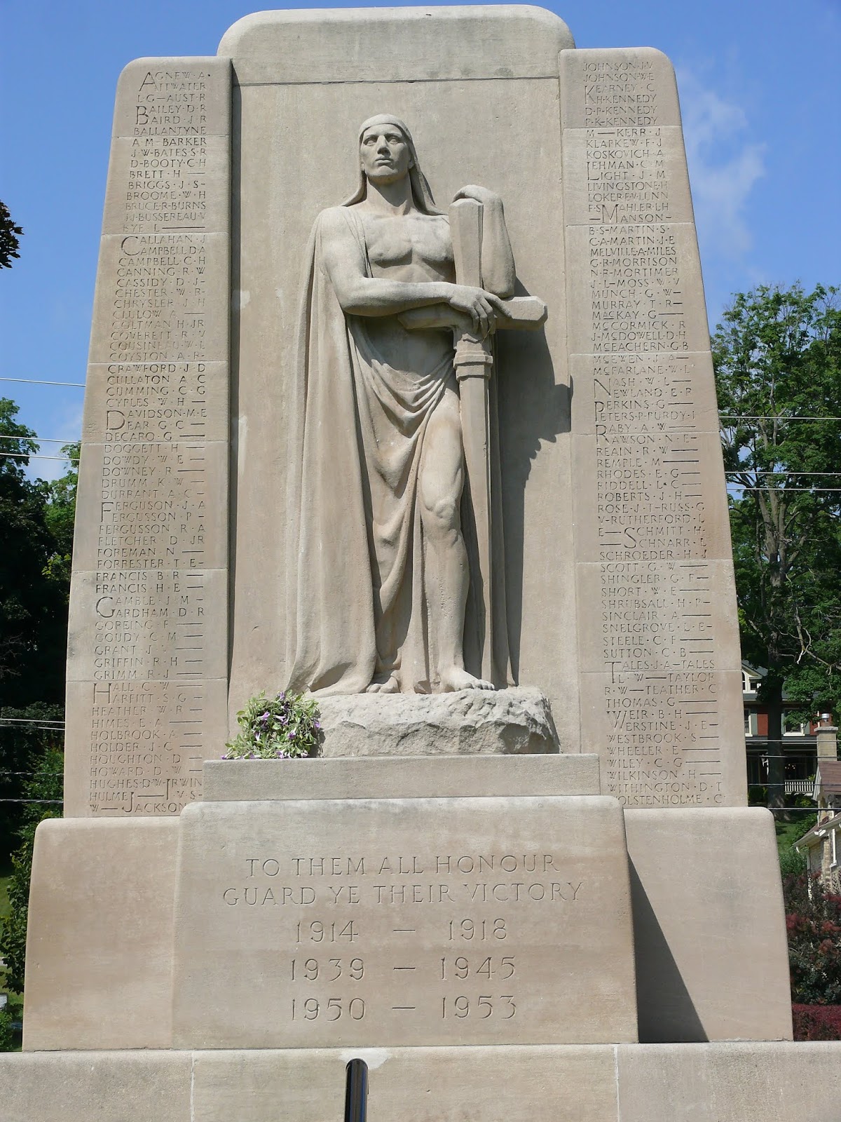 The symbolism of the cenotaph is best described by Miss Loring herself. "Out of a large central stone merges the heroic figure of "Victory" on one side and a mourning figure of "Peace" on the opposite side. This central block is supported at either end by two pylons on which are carved the names of those whose sacrifice upheld Victory and made Peace possible. The symbolic figure of "Victory" stands leaning on the Sword of Sacrifice. He looks to the future and speaks: To them all honour Guard ye their victory On the opposite side the woman also speaks. She is "Peace". Peace mourning for great is the sacrifice these her sons have made that Peace might endure. She leans with one hand on the shield, for it is through battle that they achieved peace. And with the other hand she offers them the laurel branch that their sacrifice may be ever glorified. In Peace and Honour Rest you, my sons The dedication ceremony started at 2:30pm when "the stillness was broken by the deep tones of "O Canada" played by the combined Highland Light Infantry, Salvation Army and Galt Kiltie Bands.