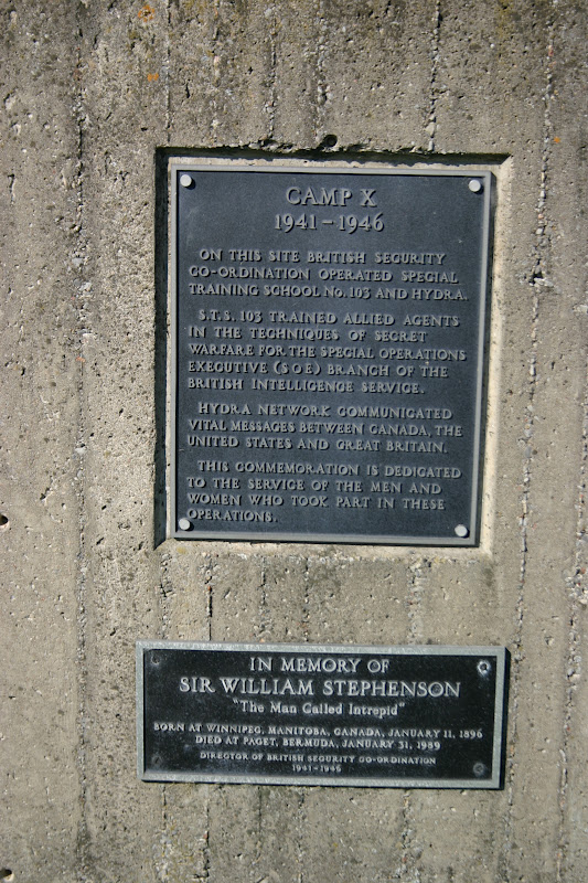 Dedicated to the men and women who participated in insurgency operations and to Sir William Stephenson "The Man Called Intrepid". It was erected by the Town of Whitby. This memorial to Camp "X" is located at the site of the British Special Training School No. 103 which operated from 1941 to 1946. William Stephenson enlisted as a Canadian Engineer in 1914 and saw action early during the First World War as a signaller with the 101st Battalion of the Canadian Expeditionary Force. Sgt Stephenson was badly wounded during a gas attack and, after recuperating, was commissioned into the Imperial Army and transferred to the Royal Flying Corps. He served with distinction during the war and was decorated several times for conspicuous gallantry and skill – being awarded the Military Cross, the Distinguished Flying Cross and the Croix de Guerre. During the Second World War, William Stephenson was appointed Director of British Security Coordination as well as Prime Minister Churchill’s personal representative to President Roosevelt. He was recognized for his services to the Commonwealth during the war years by being knighted in 1945 as well as receiving the United States Presidential Medal for Merit (that country’s highest award for a civilian) and the Order of Canada.