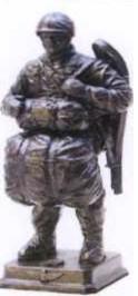 This sculpture, “CANADIAN JUMPER”, is a bust depicting a paratrooper wearing a Kevlar helmet, C-7 rifle (attached to slung snowshoes) and parachute rigging. After the disbandment of the Canadian Airborne Regiment, a company of paratroopers is now assigned as one of the companies in each of three Light infantry Regiments (PPCLI, RCR, and R22eR). “CANADIAN JUMPER” has a distinct hat badge placed on the top surface of its base (between the Paratrooper’s feet); the badge of the former Canadian Airborne Regiment. This sculpture was unveiled in March 2013 by the Royal Military College of Canada, and is dedicated to current and past Canadian paratroopers.