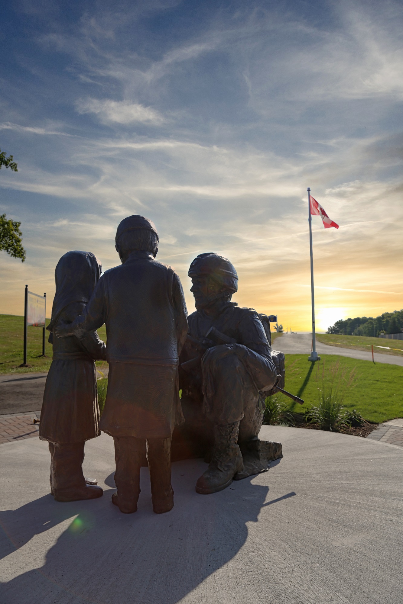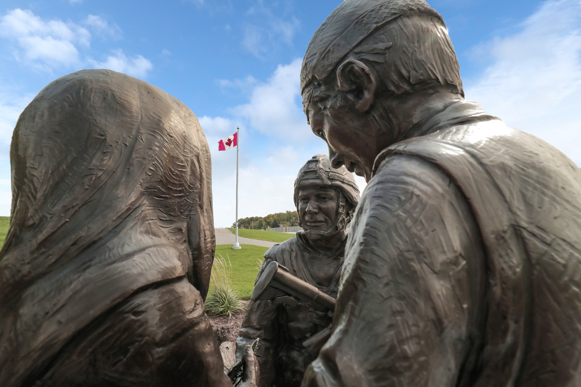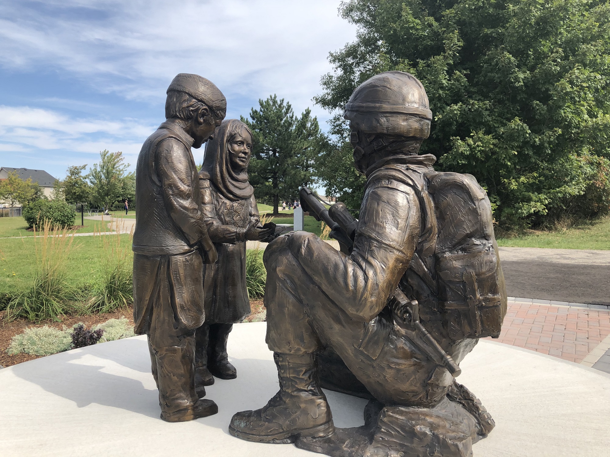 A Canadian Soldier in Afghanistan was designed by local artists Donna Pascoe and Peter Turrell. They were contacted by Valerie McGrady, the mother of Corporal Matthew McCully who was killed by a roadside bomb on May 25, 2007. Matthew inspired everyone to create a statue depicting a soldier's bravery and compassion. Donna and Peter researched and met with soldiers that served in Afghanistan to talk about their experiences. Their ideas were shared and they passed around photos of proposed ideas, receiving input from a number of soldiers who guided them toward the final piece.