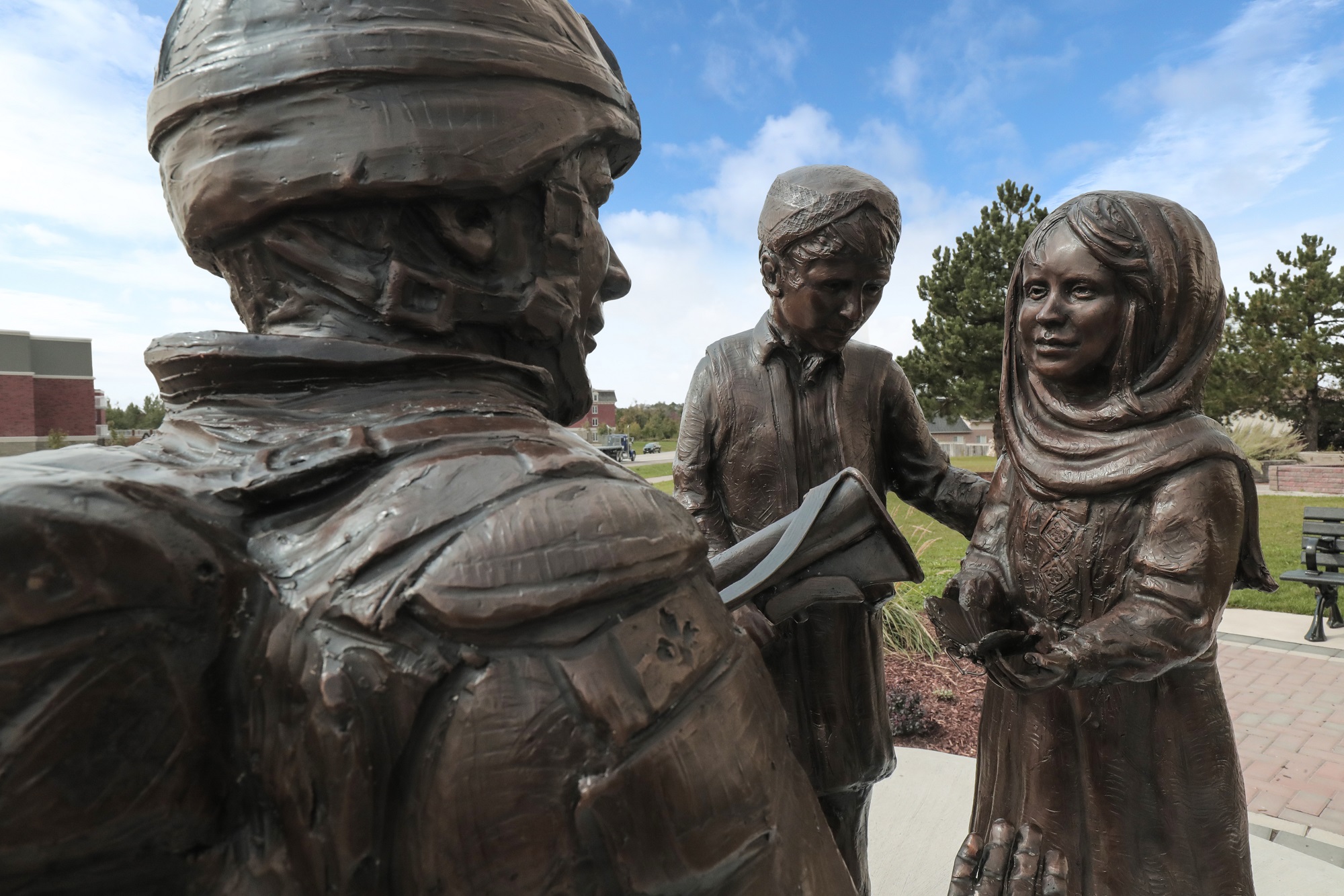 Donna borrowed a combat uniform for authenticity when creating the model for A Canadian Soldier in Afghanistan. She tried to imagine the multitude of thoughts and feelings both soldiers and citizens must have struggled with every day. Issues of duty, trust and fear. Donna chose to show a compassionate human side reflected in the heart-felt exchange between two Afghan children and the kind soldier kneeling in front of them.