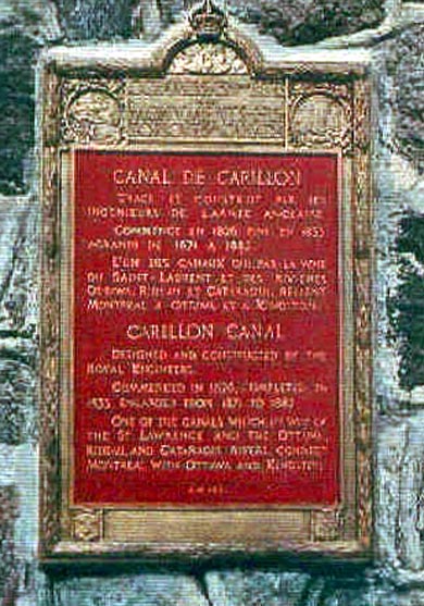 This memorial, erected in 1931 by the Historic Sites and Monuments Commission of Canada, is dedicated to the memory of the Carillon Canal. The canal was constructed by Royal Engineers between 1826 and 1833 and helps to connect Montreal with Ottawa and Kingston. This canal was also enlarged some 50 years later.