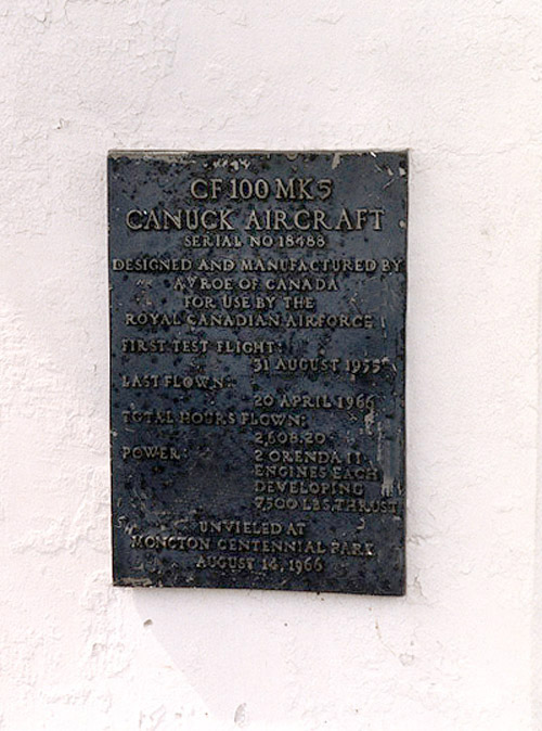 This memorial is dedicated to the memory of the use of the CF 100 MK5 Canuck Aircraft by the Royal Canadian Airforce. It was erected August 14, 1966.
