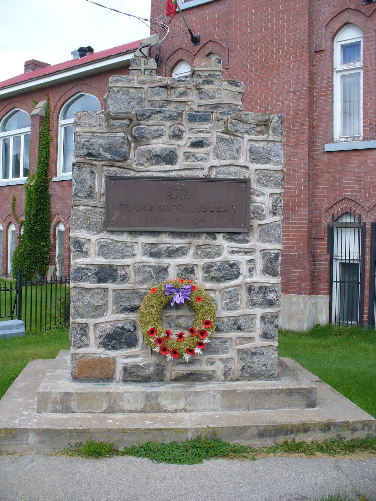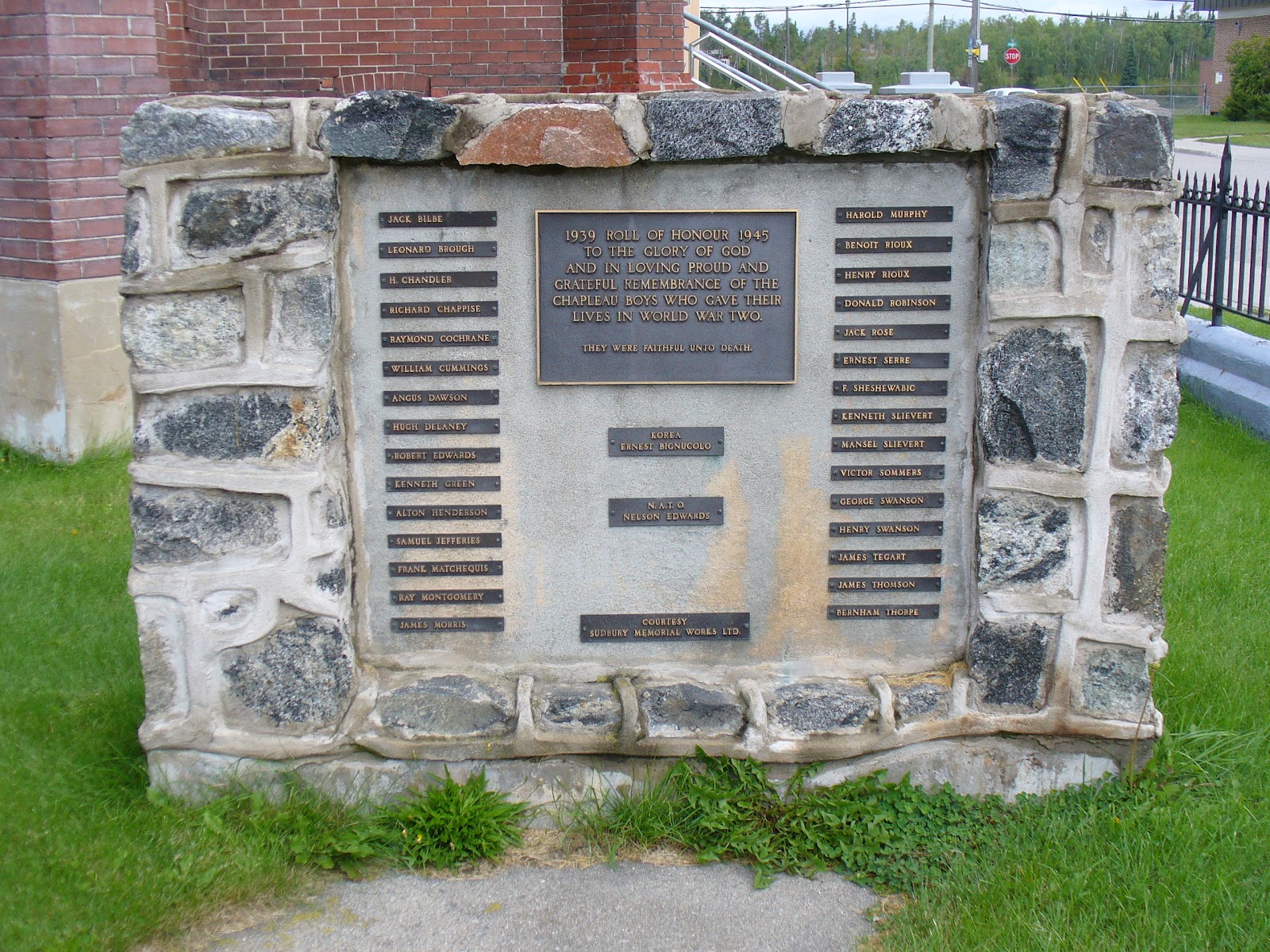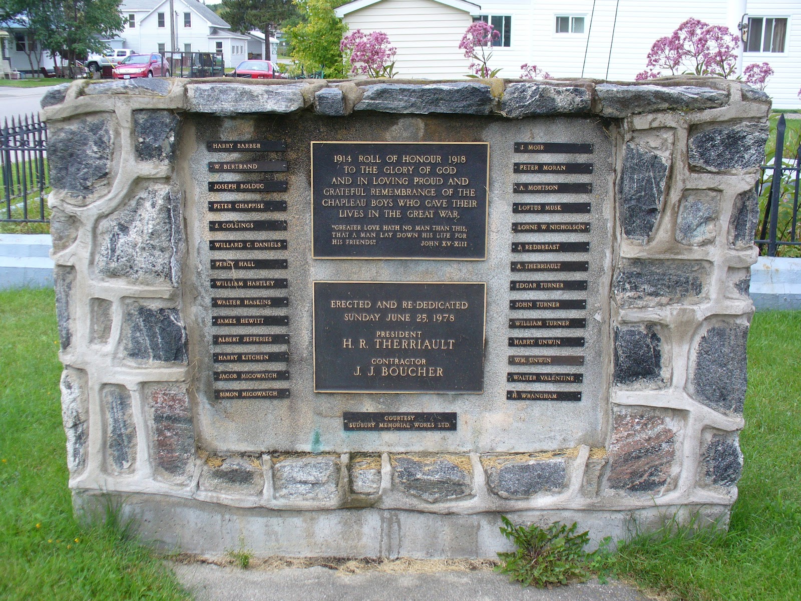 The unveiling of memorial walls at the Remembrance Day service on November 11, 1978, completed the move of the cenotaph to its new location beside the Royal Canadian Legion Hall. The unveiling of the First World War wall was done by Frank Cranston, Chapleau's last surviving Veteran of the First World War, and air cadet Bonnie Goheen. The unveiling of the Second World War wall was done by Muriel (Hunt) Morris and Eric Groulx.