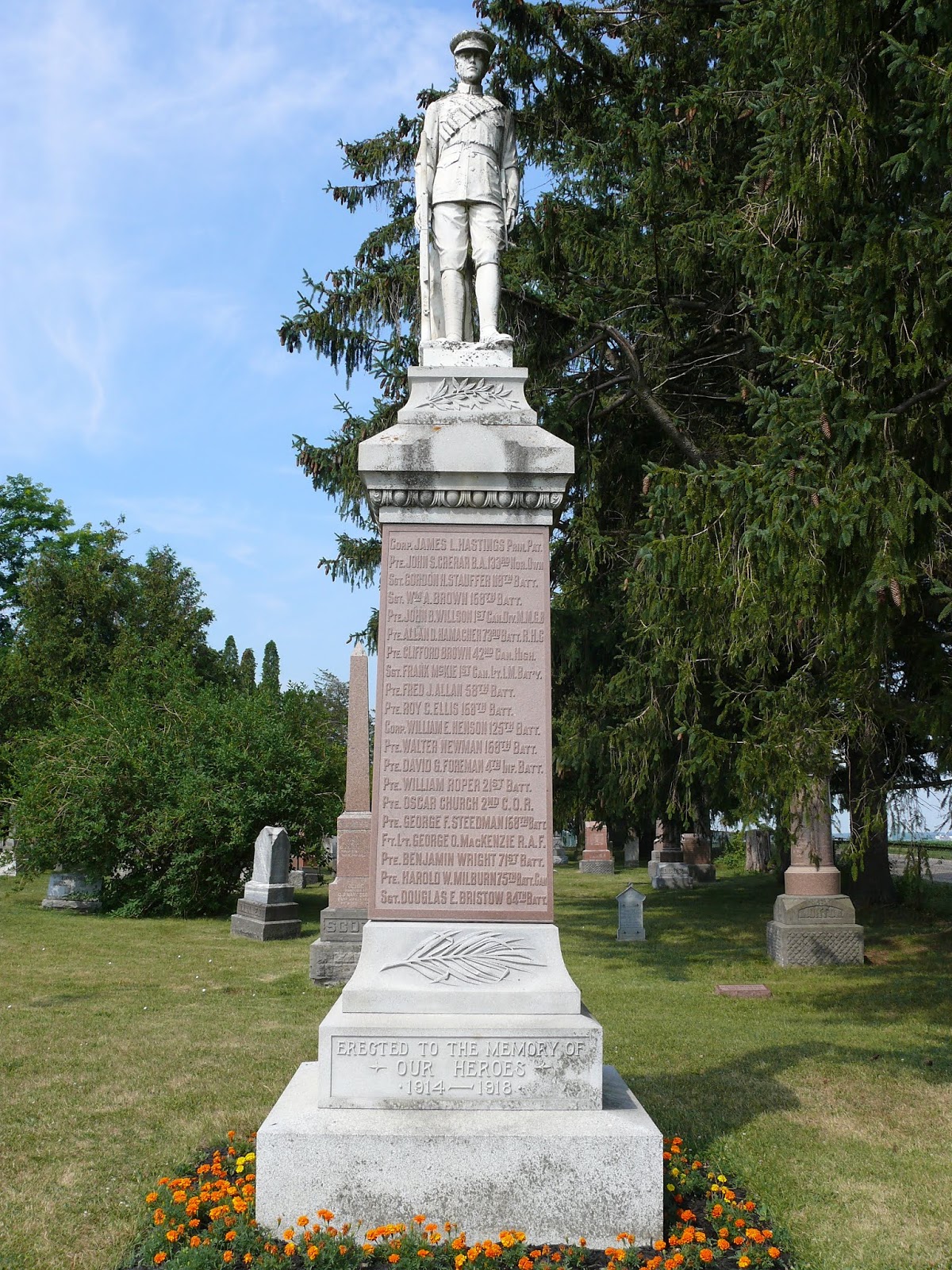 This memorial was constructed of granite imported from Scotland and the statue of a soldier imported from Italy in 1920. It was erected on September 20, 1920, and commemorated those from the community who made the supreme sacrifice in the Great War. The memorial was the result of a committee being formed for the purpose of erecting such a memorial, and money was raised by the public in order to do so. On the day of the unveiling, a service was held by William R. Henderson.