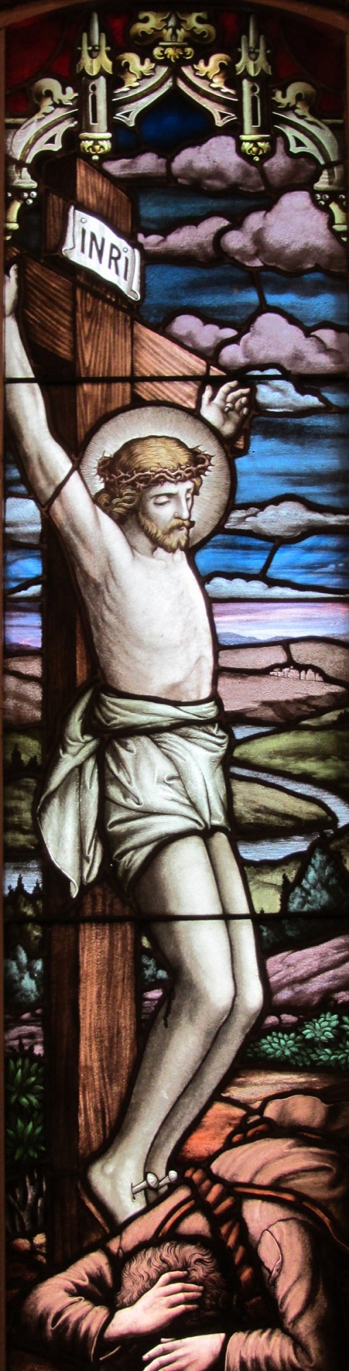 At the top left section is a half-length figure of an angel with a shield with the motif of a sword and a banderole bearing the word "FORTITUDE". Below is a depiction of Christ carrying the Cross of Calvary, surrounded by Roman soldiers. The bottom left section is the Crucifixion and a soldier with a rifle falling at the foot of the cross.