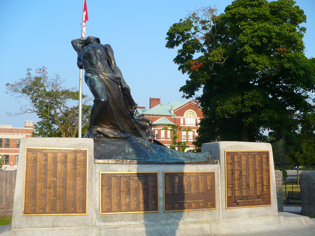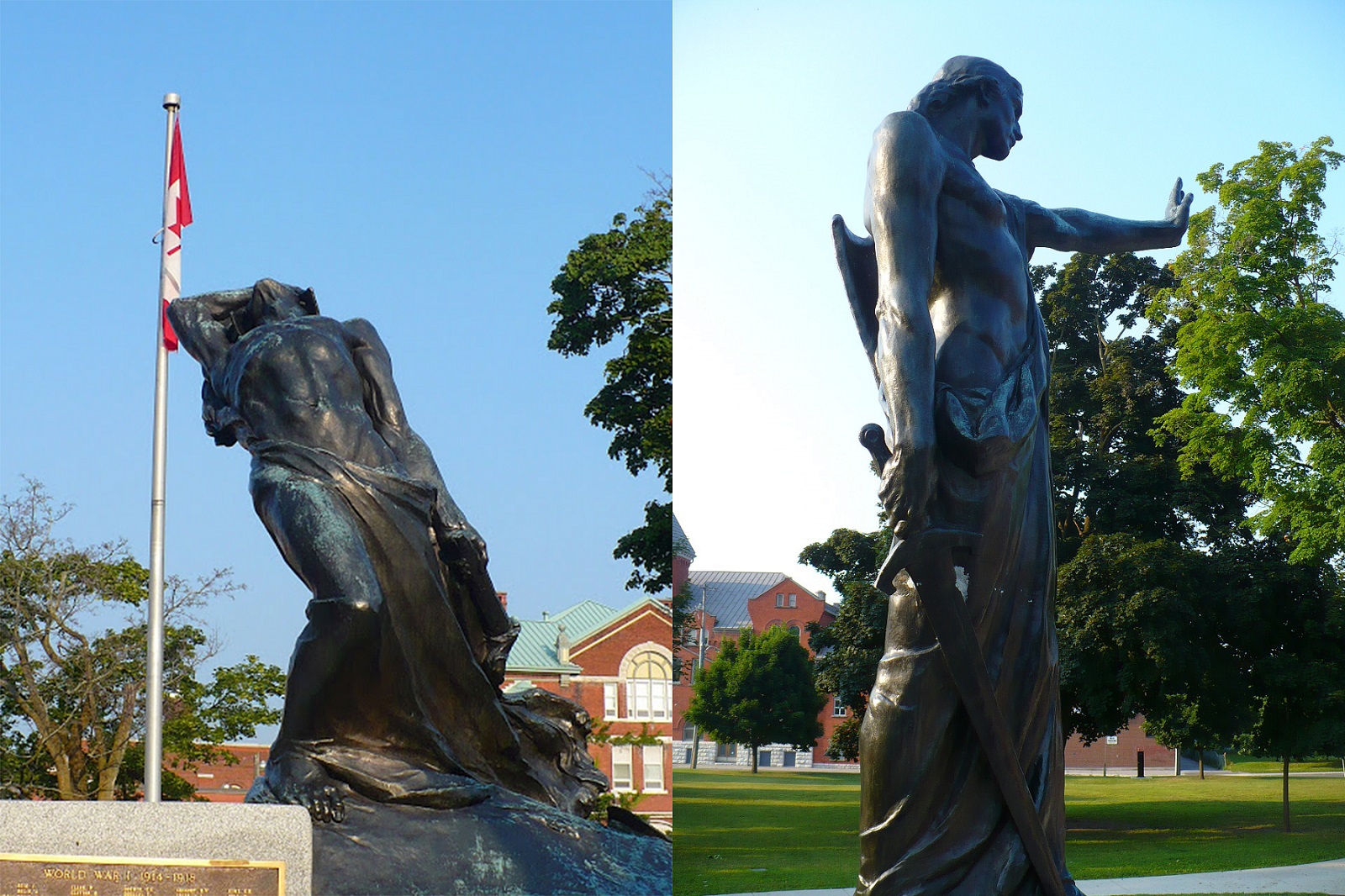The Citizens' War Memorial sits on a circular, stepped base made of white granite and the pedestals for both bronze figures are also of white granite. The west pedestal is carved on the front and back with the names of war victims from the First World War. The four bronze plaques placed over the inside of the western pedestal are inscribed in raised gold lettering with the names of all war dead from the World Wars and the Korean War. A dedication plaque is on the eastern side of the east pedestal. Above the pedestals are two bronze figures of heroic dimensions. The first is known as the Knight of Chivalry, which portrays a brave Canadian soldier standing tall, a sword in his right hand and his left hand is held up as a warning to stop. The other figure shows a cringing and recoiling figure in fear with his hand on his fevered brow, known as the “defeated enemy.”