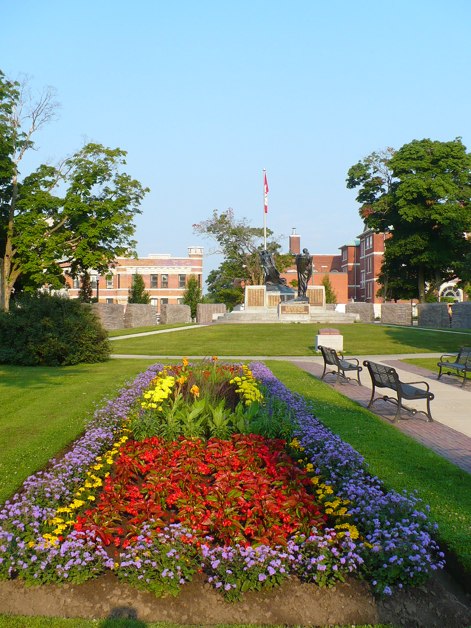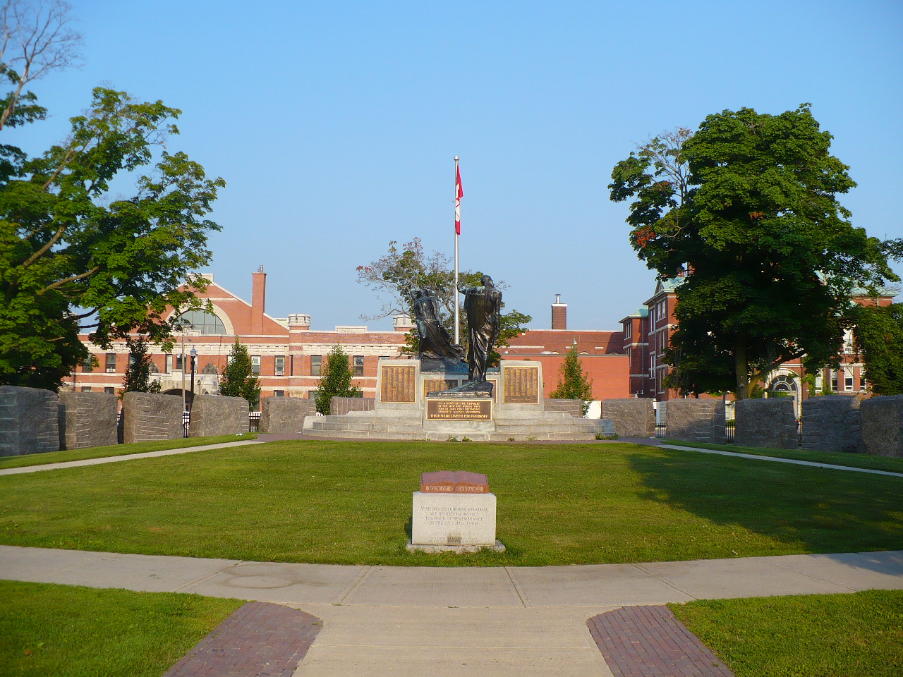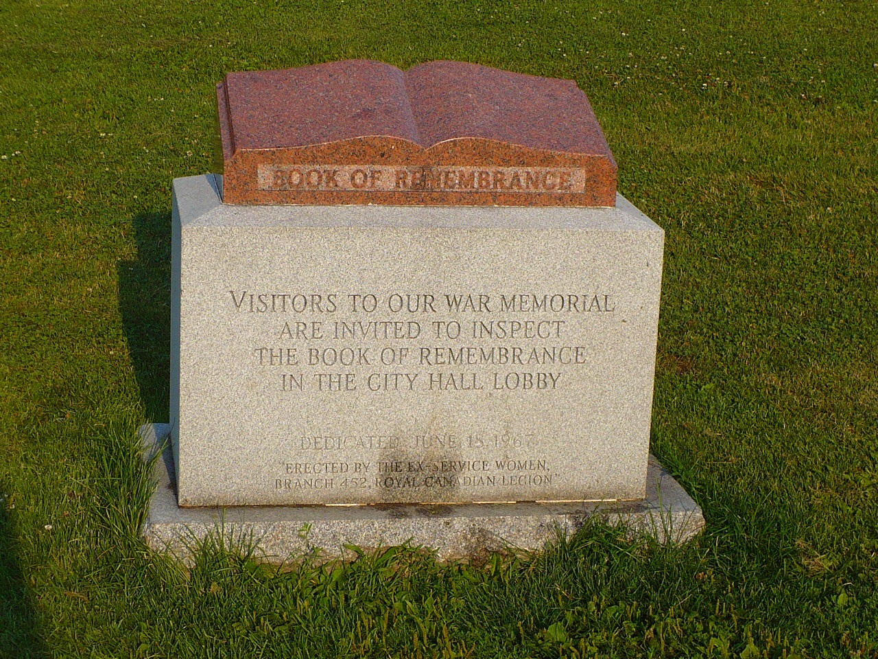 A monument was unveiled on June 18, 1967, by the ex-servicewomen's branch 452 of the Royal Canadian Legion. The monument is a polished red granite Book of Remembrance sitting on a rectangular pedestal of smooth white granite with a rectangular base of rough white granite.