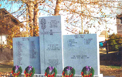 Cochrane Cenotaph was unveiled on 14 October 1995 through the efforts of the Royal Canadian Legion Branch No. 15 and citizens of Cochrane. It was dedicated to the local war dead of the First and Second World Wars. Later inscriptions were added to honour the United Nations and Korean War. Then with the 2017 refurbishment, these latter inscriptions were changed to Korean War, peacekeepers and Afghanistan.