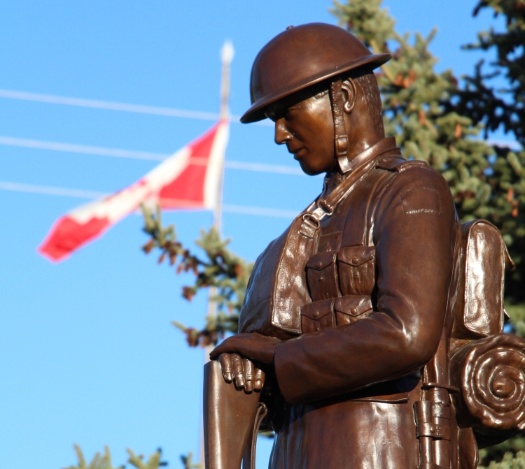 The existing cenotaph was re-engineered and flawlessly reconfigured by Terry Norman, of OnGrowing Works, with matching granite from Quebec to hold the 800 lb. statue. The bronze statue is a seven-foot portrayal of a First World War soldier in a memorial stance created by renowned bronze sculptor Don Begg of Studio West Bronze Foundry Ltd.