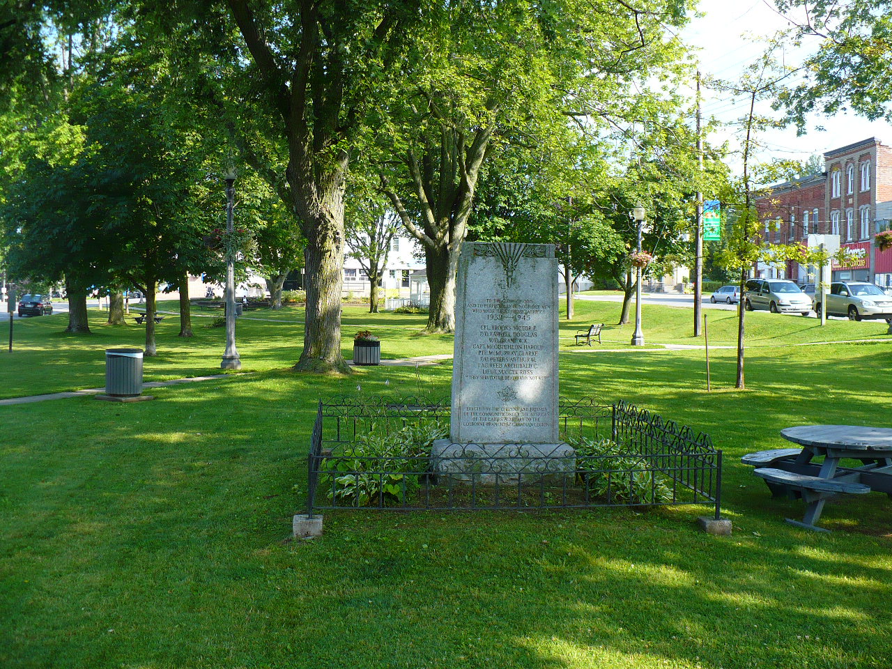 A cenotaph in memory of the local fallen of the Second World War was unveiled and dedicated on Sunday afternoon, October 24, 1948. The light grey granite stele was erected in Victoria Square Park by the Ladies’ Auxiliary of the Royal Canadian Legion Branch 187.