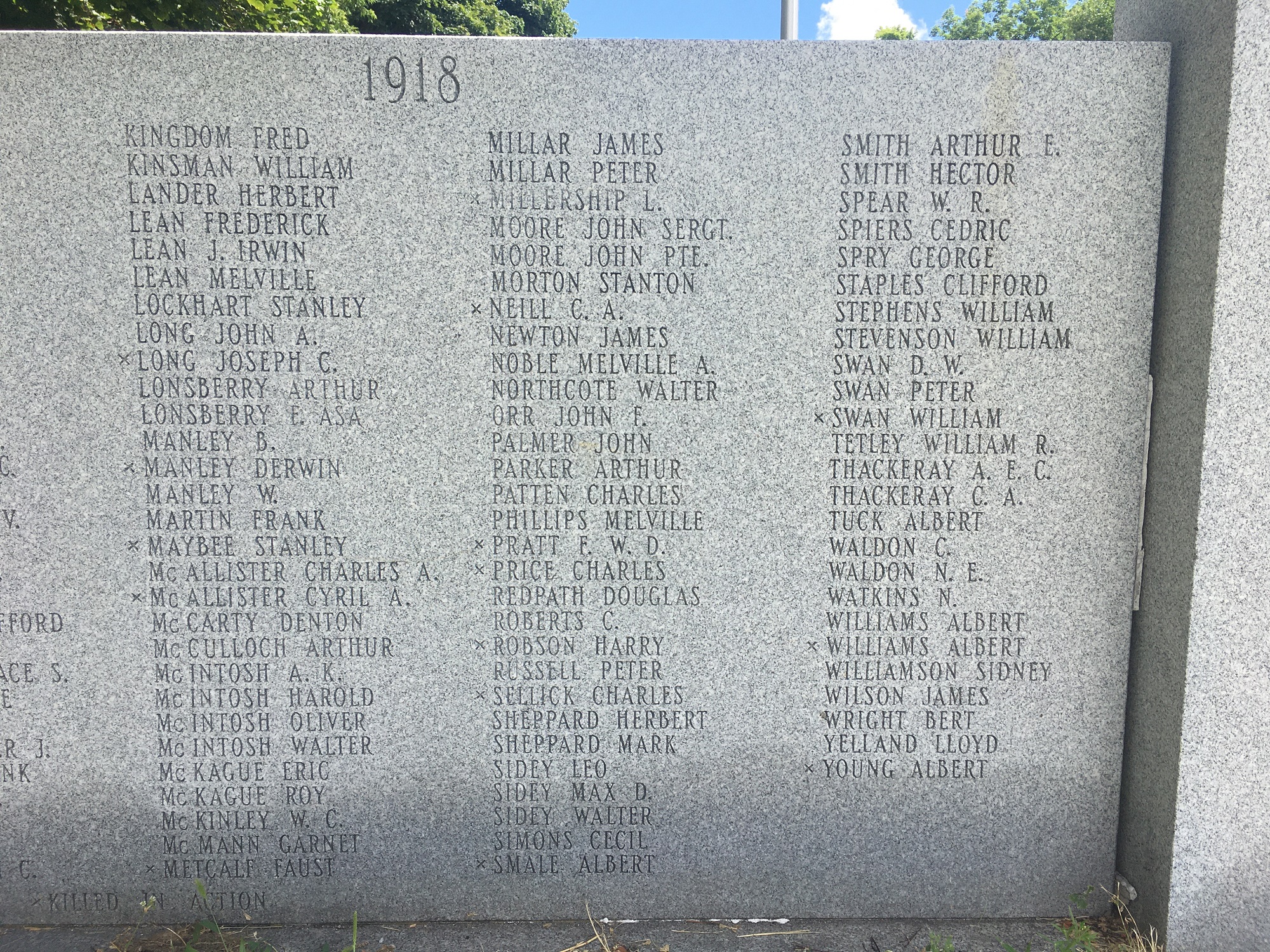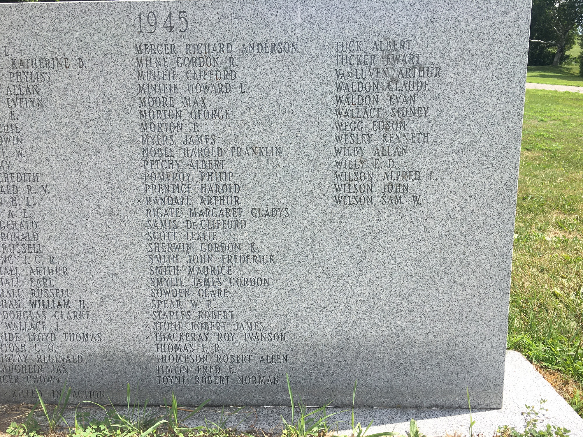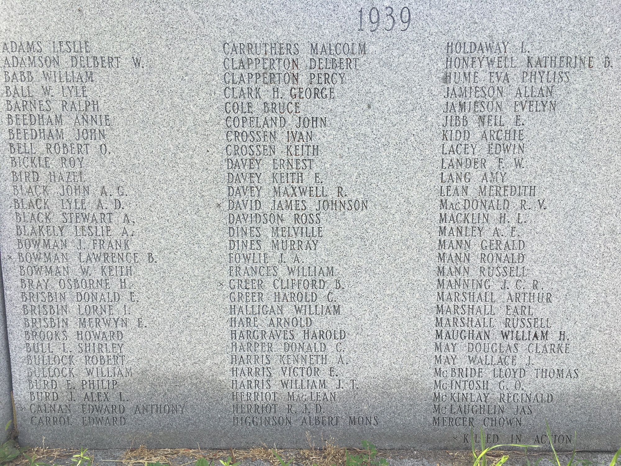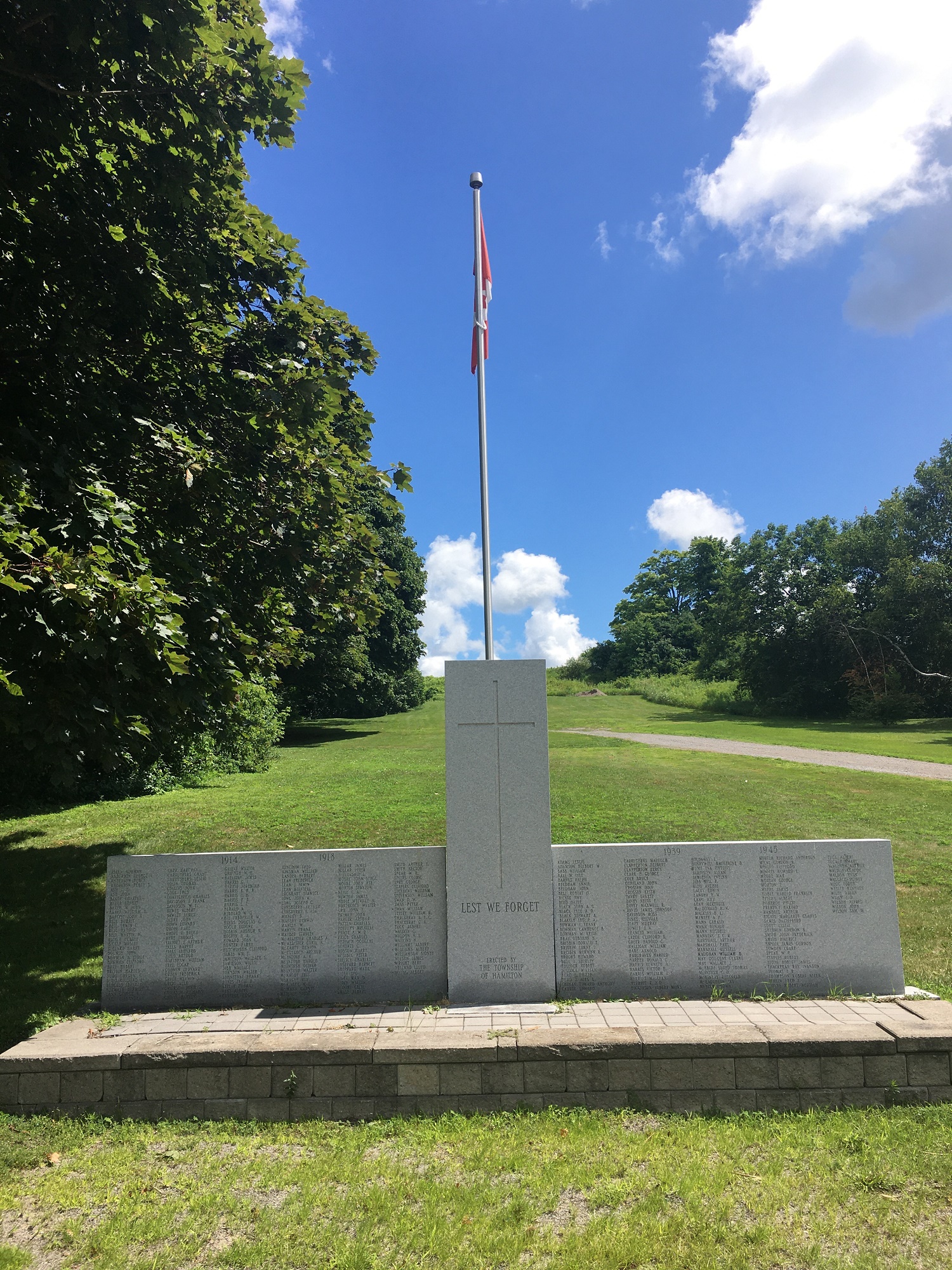 Shortly after the First World War, a tall cenotaph was erected with names from that war. Because there was no place to add the Second World War names, a new cenotaph was erected.