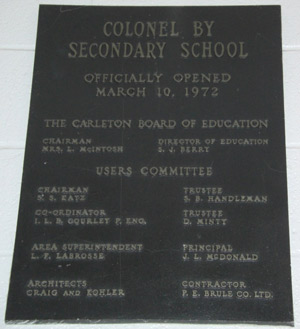 Erected by the Carleton Board of Education, Colonel By Secondary School was unveiled on March 10, 1972, and is dedicated to Lieutenant-Colonel John By, Royal Engineers. He is the builder of the Rideau Canal 1826-1832 and founder of Bytown.