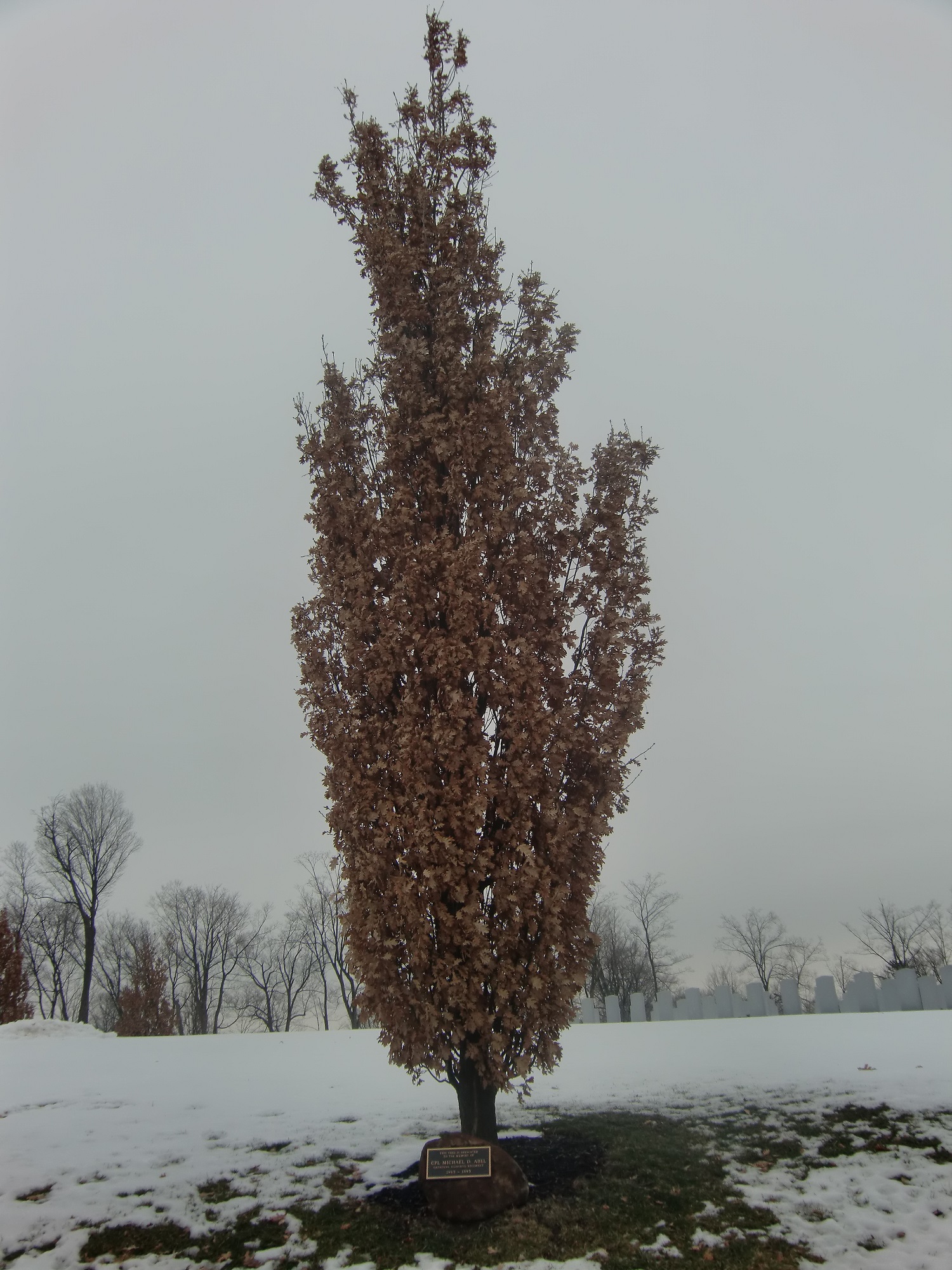 This tree is dedicated to the memory of Corporal Michael D. Abel, who served in Somalia as part of the Canadian Airborne Regiment.
