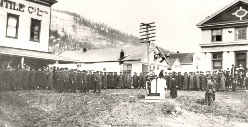 Major Mallandaine, O.C. of the Forestry Draft, unveiled the tablet with the hope that one day the citizens of Creston might erect a monument of more lasting material. The tablet design was worked out by Major Mallandaine, and the handiwork of Pts. Thompson, Harkness, and Reed. The lettering was the work of Sergeant Crowe, paymaster of the 107th (East Kootenay Militia).